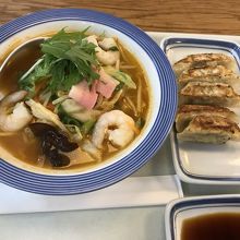 季節限定メニューのトムヤムクンちゃんぽんセットを注文。タイの方に通用するかはわからないが、ピリ辛のスープは魚介系出汁がちゃんと入っていて美味しい。パクチーもたっぷり入っている。またぷりぷりした海老がたくさん入っていたのが嬉しい。麺が少ないサイズしかないようだが、餃子とセットすれば満足。