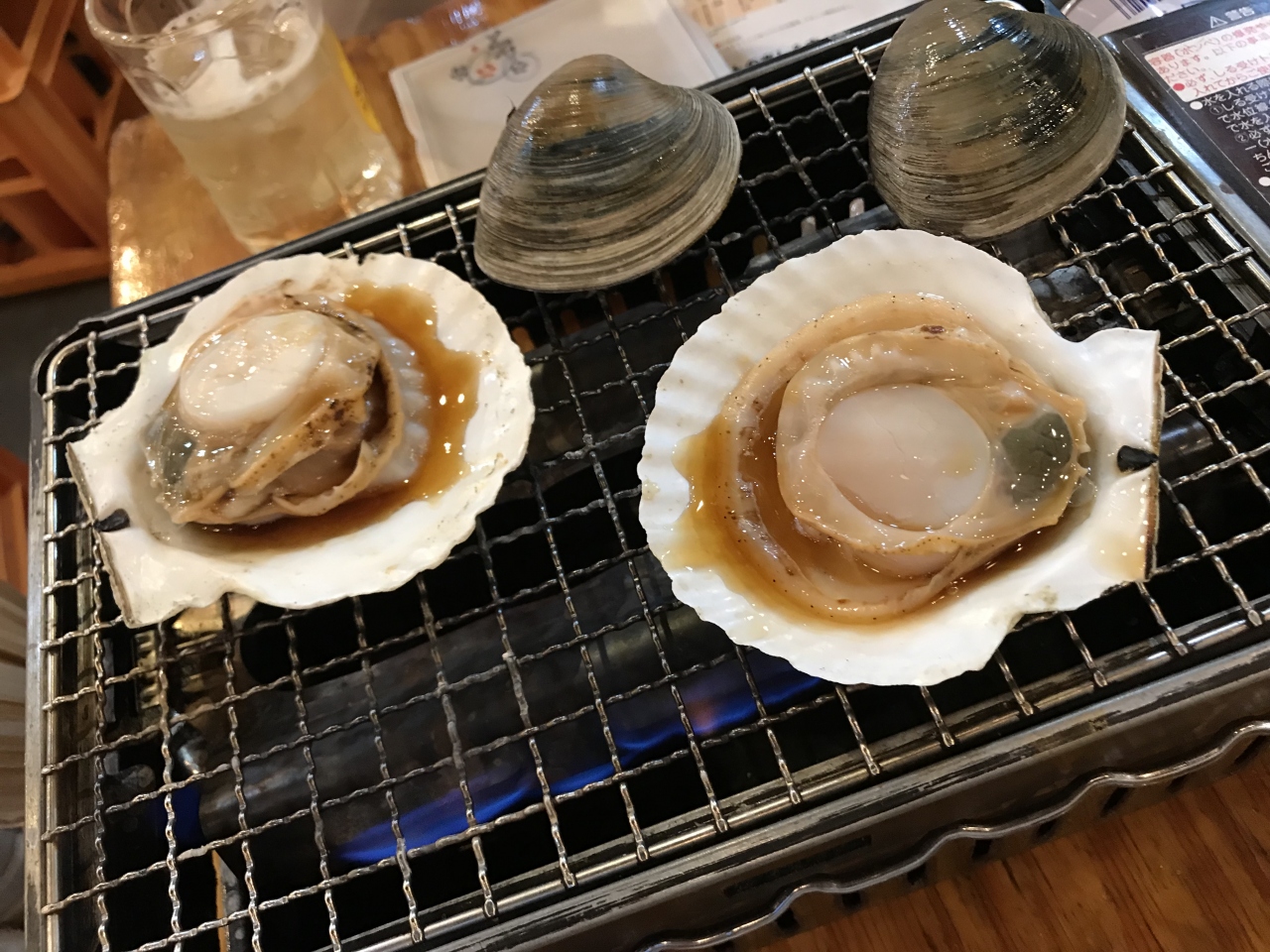 生ビールに、ホタテとホンビノス貝の浜焼き