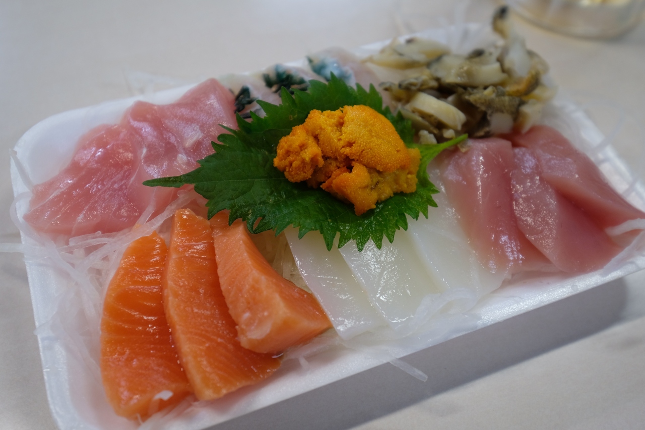 お刺身がメチャクチャ安く食べられるんですね。1階の魚屋さんでお刺身の盛り合わせを購入し、2階のレストラン街?で、生ビールをオーダーして頂きました。