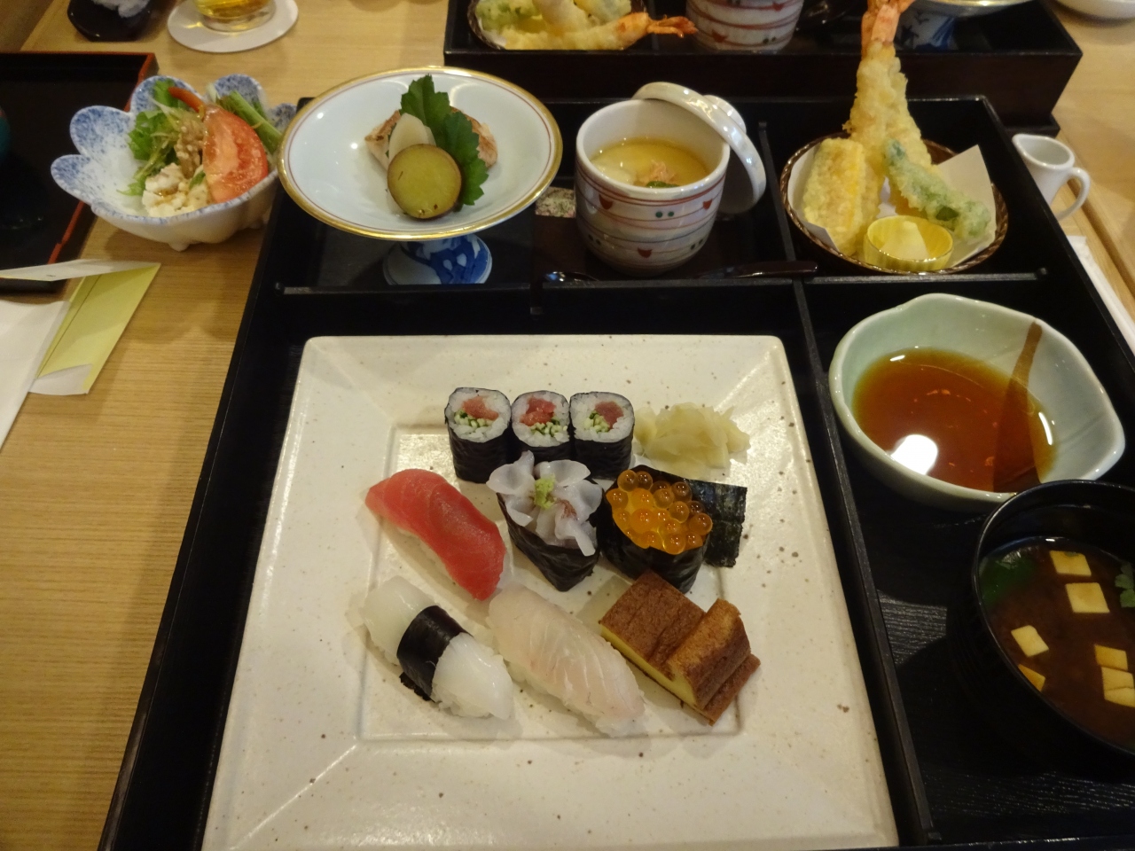 寿司の他、天ぷら、茶碗蒸し、サラダ、前菜風小鉢、味噌汁、そしてデザートと飲み物付き。