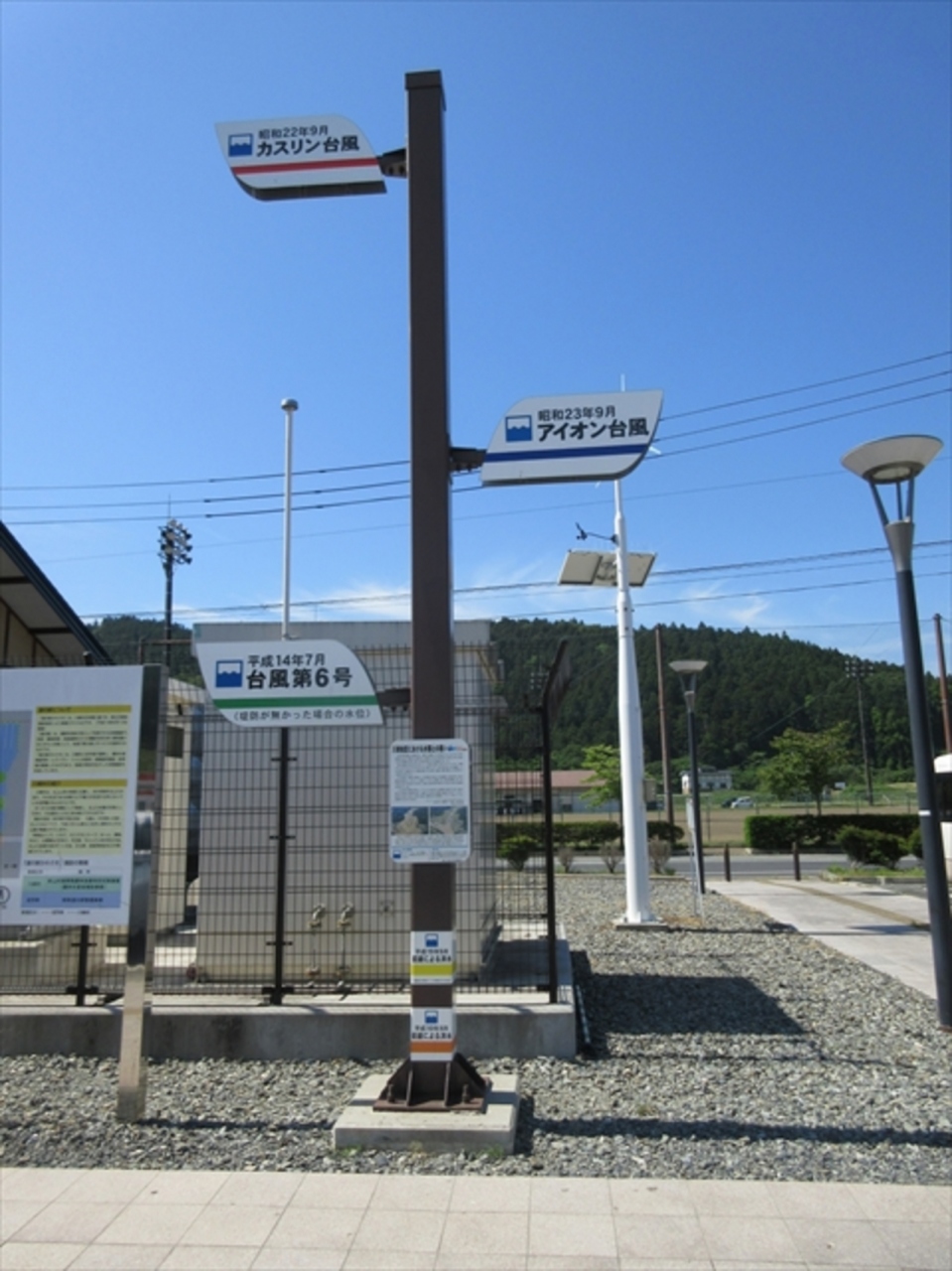 国道284号線沿いにあるため、便利な道の駅です。旧川崎町は北上川流域の河川に囲まれた土地であり、台風の際にはしばしば大洪水の被害があったそうで、道の駅には、各台風でどこまで浸水したかを示すモニュメントがありました。川の側だけあって、モズクガニが有名とのことです。