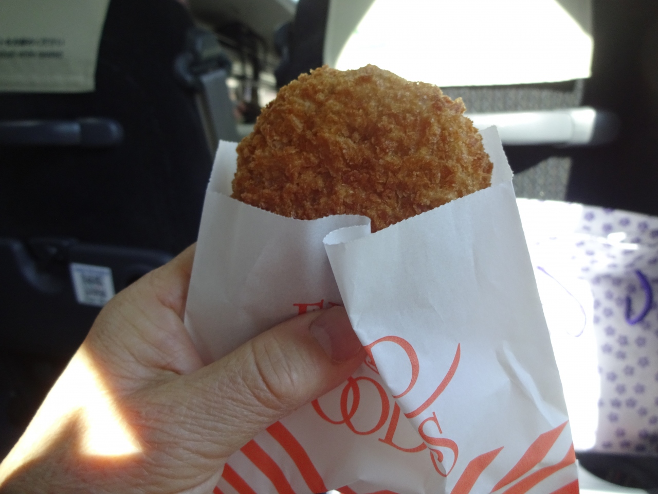 短時間の休憩タイムに寄っただけなのでお土産物色はせず、看板に連られて「飛騨牛コロッケ」250円を買って食べました。
