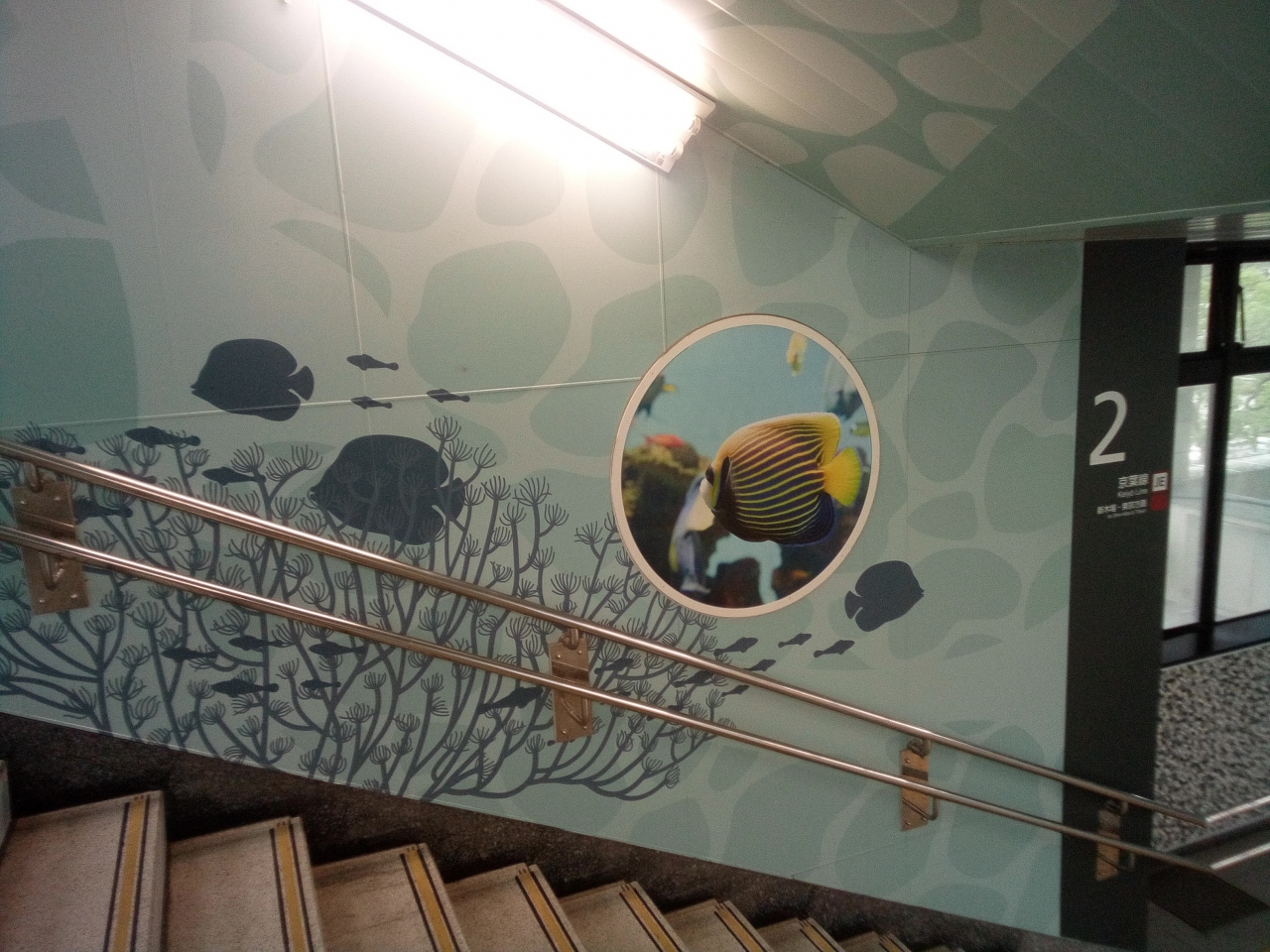 線路は高架になっており改札口に行くためには階段を下りていきます。階段のいたるところに水族館に因んだ絵があり、水族館に行く雰囲気を盛り上げてくれます。実際は水族館だけではなくかなり広い公園があり、子ども連れで賑わってました。