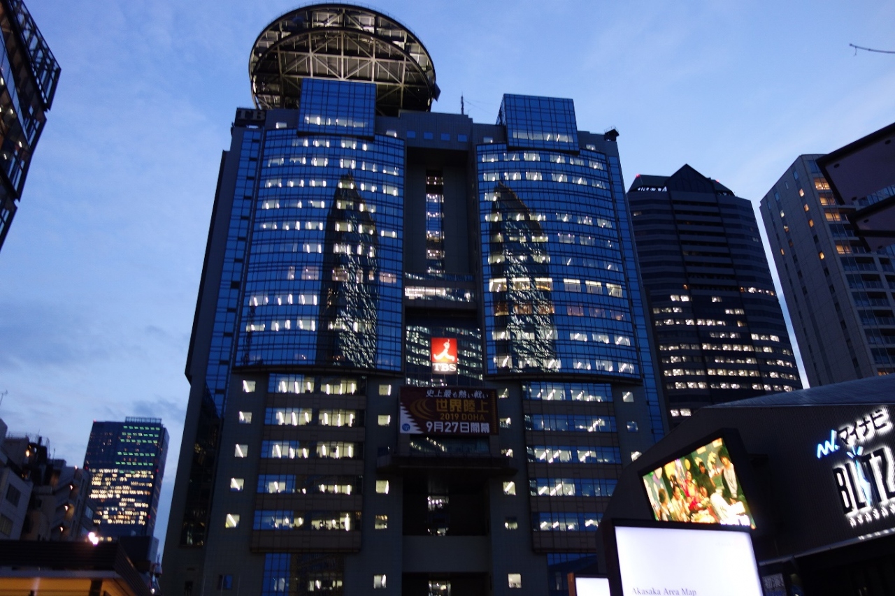 赤坂あたりのエリアを散策中こちらの場所へ立ち寄りました。赤坂サカスの敷地に建つビルのひとつで、黒っぽいガラス張りの建物がスタイリッシュです。テレビのキー局のひとつTBSの基地で、サカス内にはエンターテインメントや買い物、食事を楽しめる施設も充実しています。