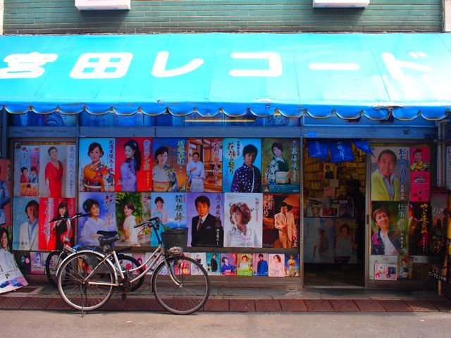 餃子の王様の並びにあるレコード店で、演歌のポスターが外壁に所狭しと貼ってあります。