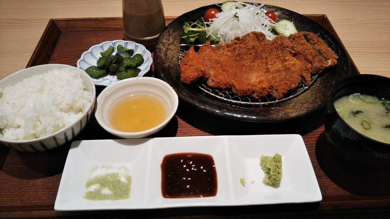 イオンモール宮崎一階にある定食屋さんです。和食も洋食もありました。チキン南蛮や鶏の唐揚げは何種類かありました。人気の牛カツ定食にしました。わさびと出汁醤油、ソース、抹茶塩で食べ比べができたのがよかったです。