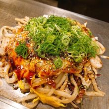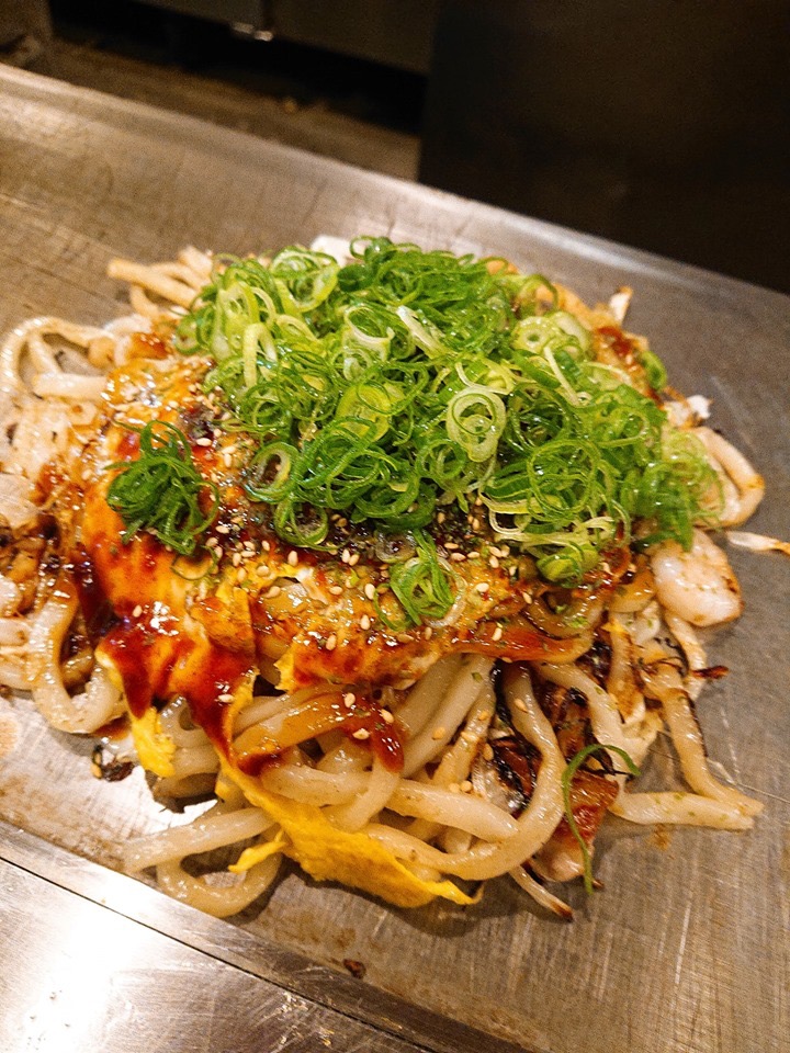 焼き上がったお好み焼きは、うどん部分の表面はカリカリ中モチモチで食感が良く、キャベツや細いモヤシなどの野菜もたっぷりでボリュームがあります。