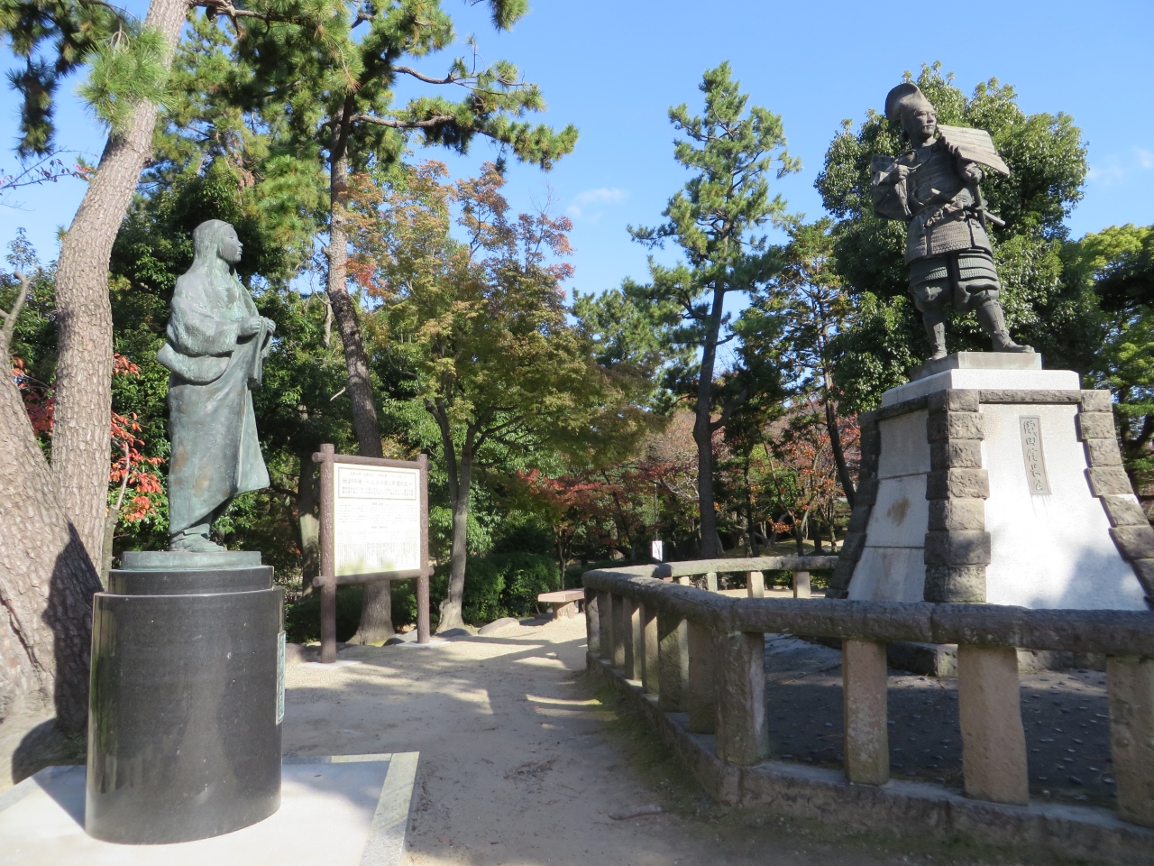 清洲古城公園から、東海道本線と東海道新幹線の線路を渡ったところに、緑に囲まれt広い公園があります。この公園の中心には、織田信長と濃姫の銅像があります。織田信長の横にいて、織田信長を見つめる濃姫の姿は、今にも動き出しそうなリアルさがあります。