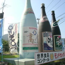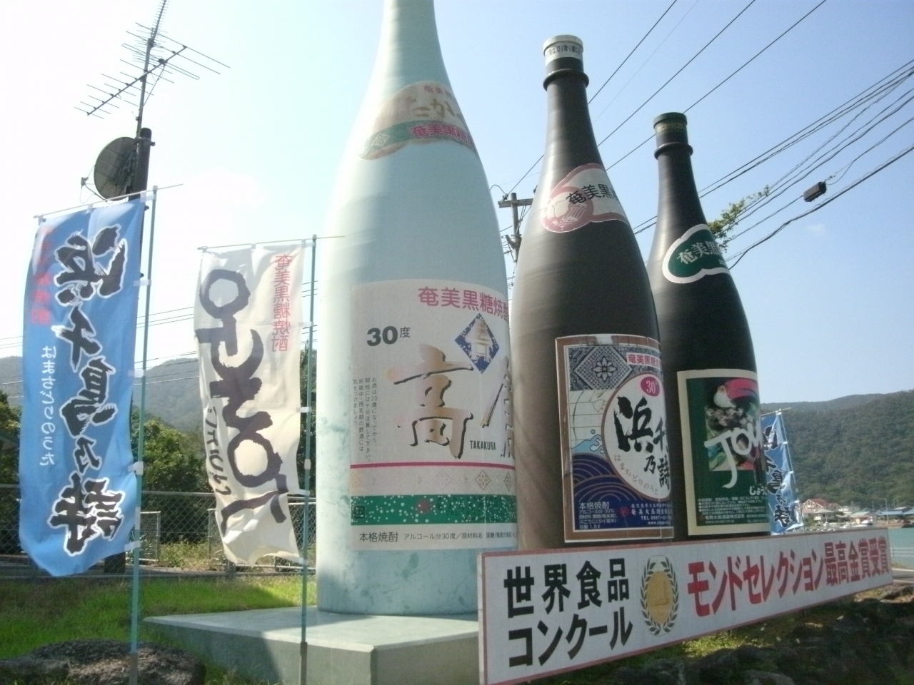 龍郷町役場から300mほど、国道58号線沿いにあります。国道沿いの入口に巨大な黒糖焼酎の酒瓶を模したオブジェが3本立っていて面白いし判りやすい。残念ながら工場見学時間に間に合わず見学しませんでした。敷地内には“浜千鳥館”という食事処と土産物の販売所があって、販売所ではここで作られた焼酎を中心に、お菓子などのお土産も販売されていて、焼酎については試飲コーナーがあり好きなだけ味見することができます。