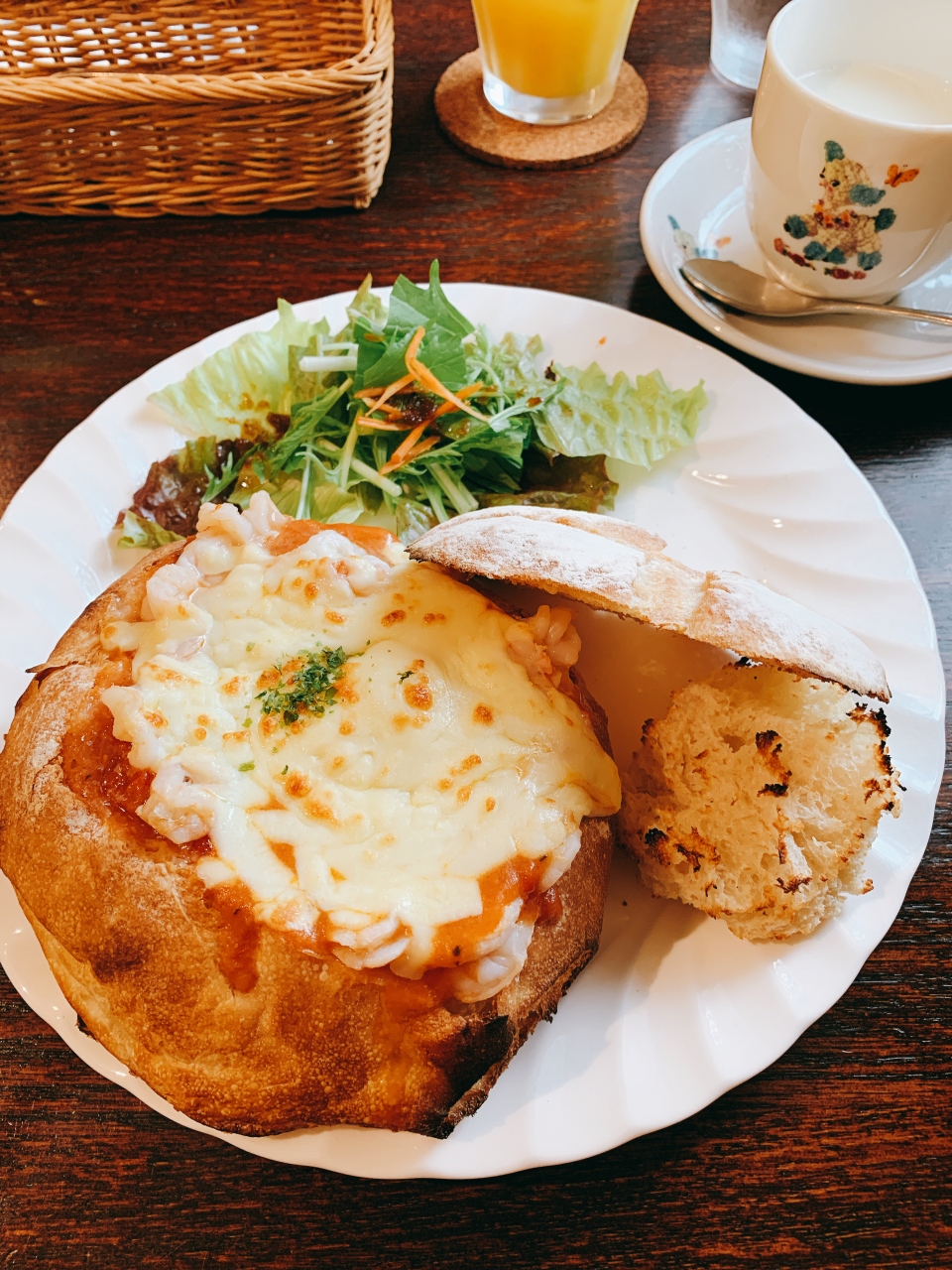 大きなパンのなかがくり抜かれて、そこにグラタンが入っています。