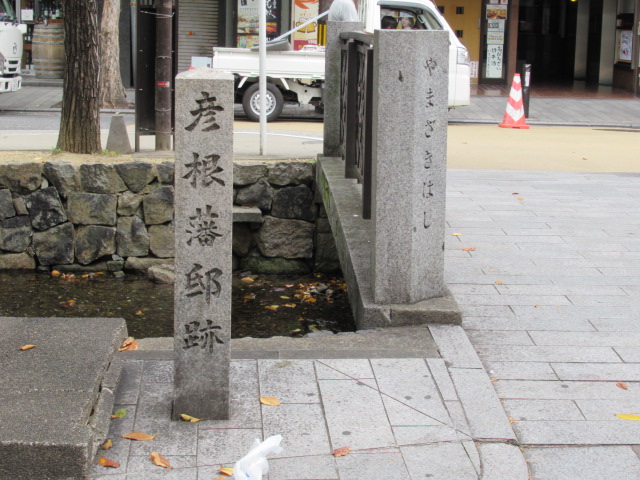 石碑の場所は木屋町通大黒町にありますが注意が必要です。北の「加賀藩邸跡」や南の「土佐藩邸跡」の石碑は木屋町通りから見えるところにありますが、この「彦根藩邸跡」の石碑は見えません。西側を流れる高瀬川に架かる六角通の橋を渡り「居酒屋おかめ」の前に建っています。見逃さない様にしてください。