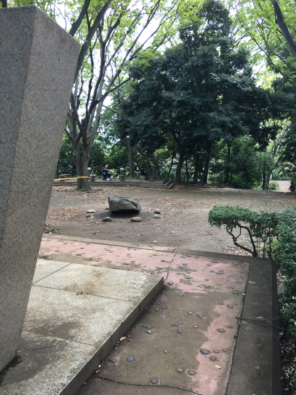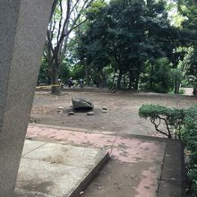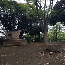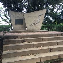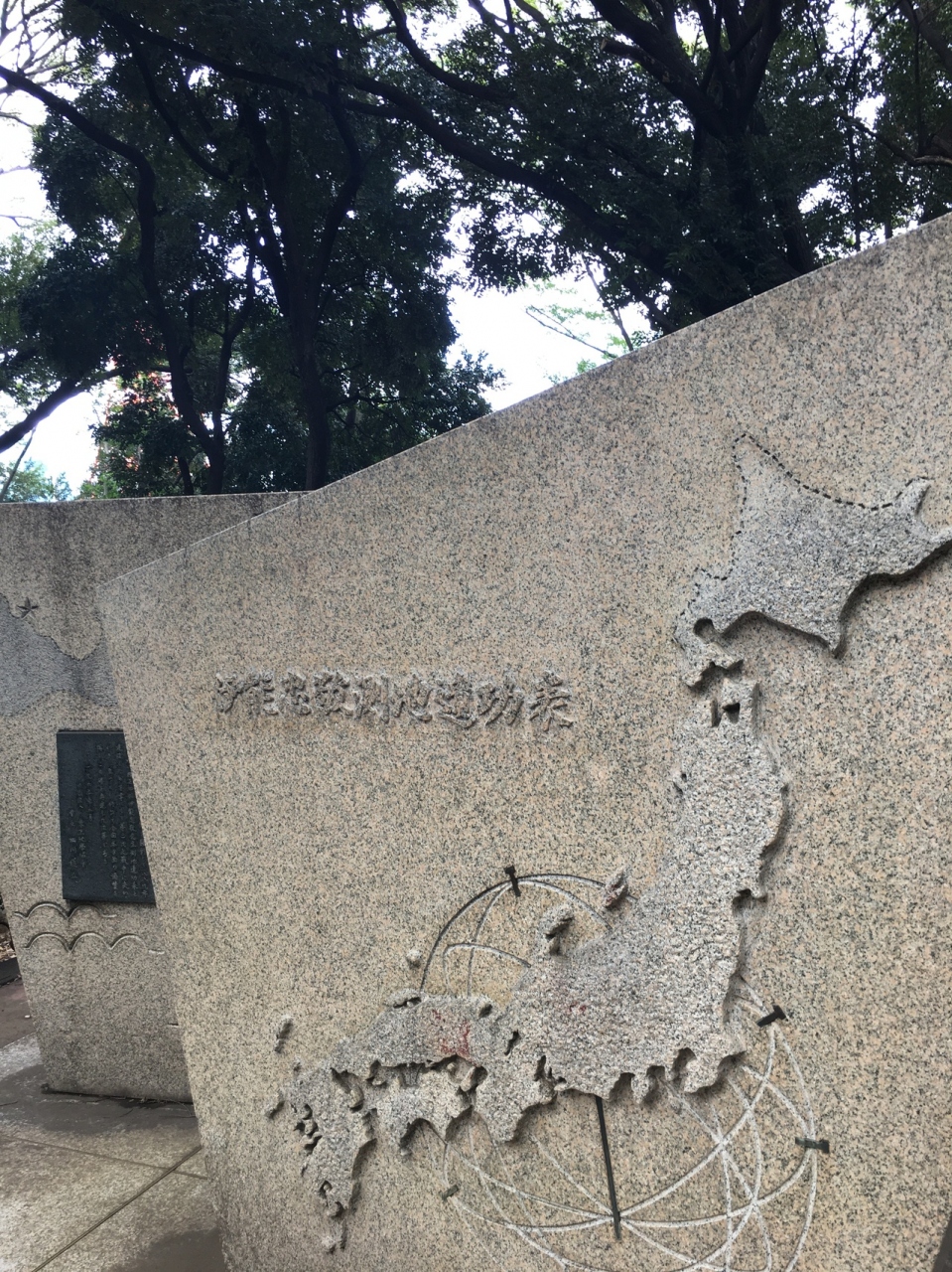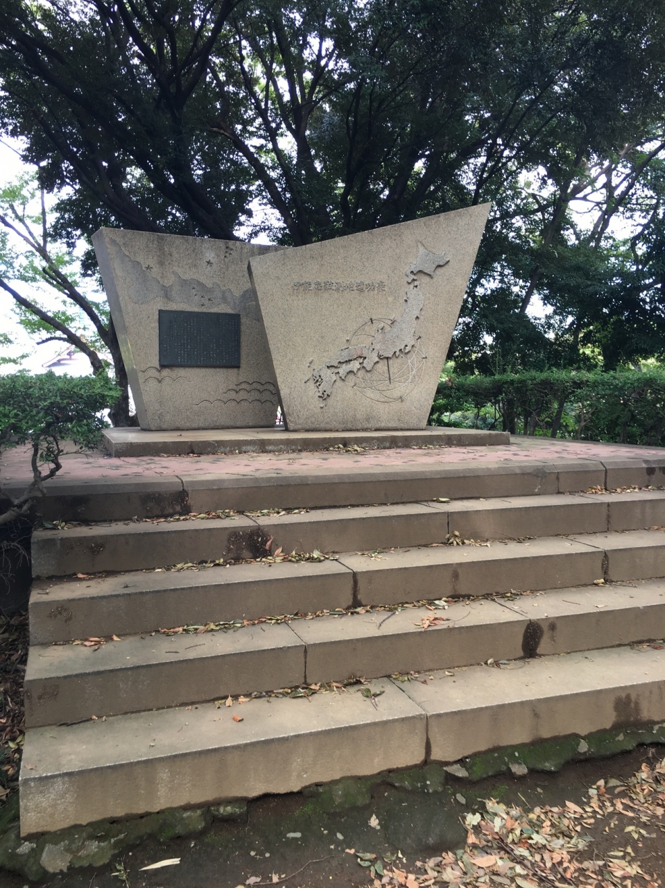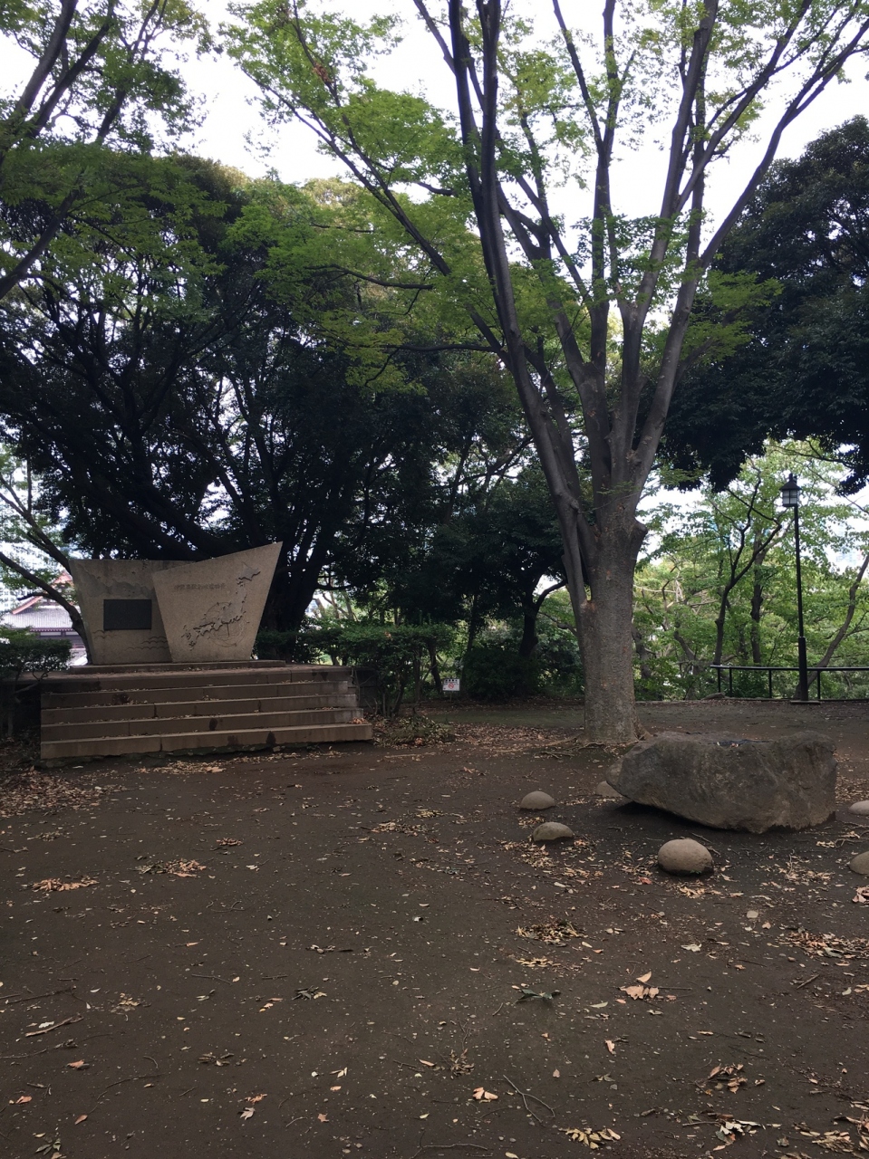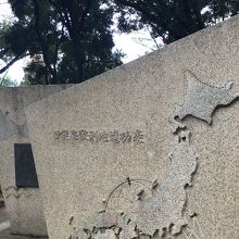 芝丸山古墳の上段部分にあり、上段部分は城の天守閣跡のような感じでした。石の石碑に日本地図が描かれ、地図上に円形の線が伸びているので伊能忠敬が旅した場所のような感じでした。階段を4段程あがった場所にあるので立派な石碑でした。