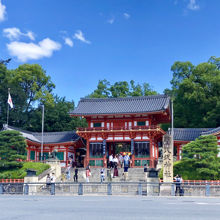 9月あたま、とても暑い日に行きました。電車の駅から徒歩で行きましたが、少し距離があり暑くて遠く感じました。駅からお店が並ぶ通りを歩き、つきあたりに八坂神社がありました。とても存在感があります。境内では結婚式をやっていていました。