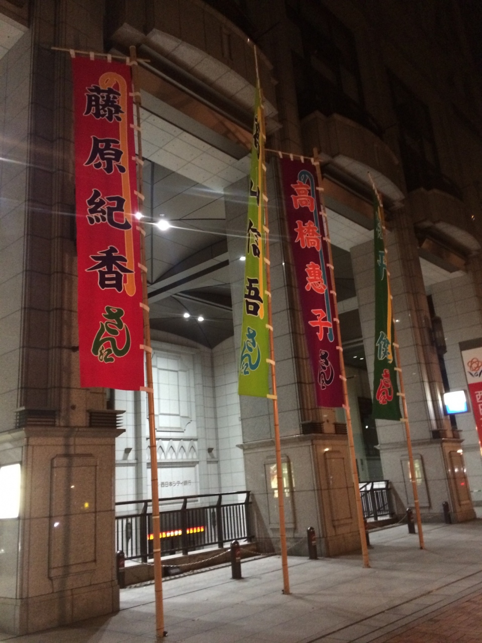 大きな赤ちょうちんがぶらさがっています。すぐに分かる博多座です。最寄り駅は地下鉄中洲川端駅で、九州最大の大きさの劇場です。この日は、「藤原紀香」と書かれたのぼりが立っていました。建物の大きさと、赤ちょうちんの大きさに圧倒されました。