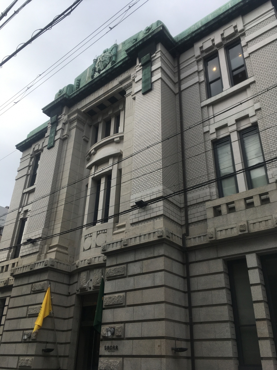 三条通りに残るレトロビルのひとつです。元大手銀行の京都支店ビルとして大正5年に建設されました。1階は煉瓦造り、2、3階は煉瓦木骨造りとなっており外観は幾何学的な装飾が特徴です。現在はファッション関係のお店が入っています。