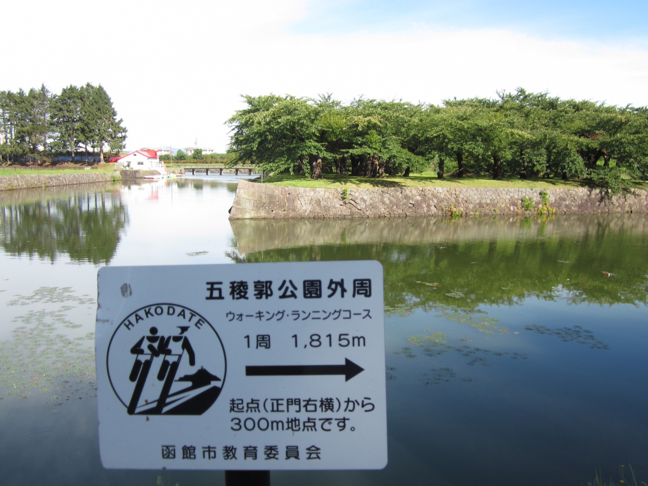 五稜郭公園に入れる橋は2か所です。公園に近づくと清掃の日だったらしくエンジン音が鳴り響いていました。歩いているうちに終わるだろうと外周を半周しました。周りはウォーキングコースに整備され夏の暑い朝でしたが歩いたり走ったりする人達がいました。