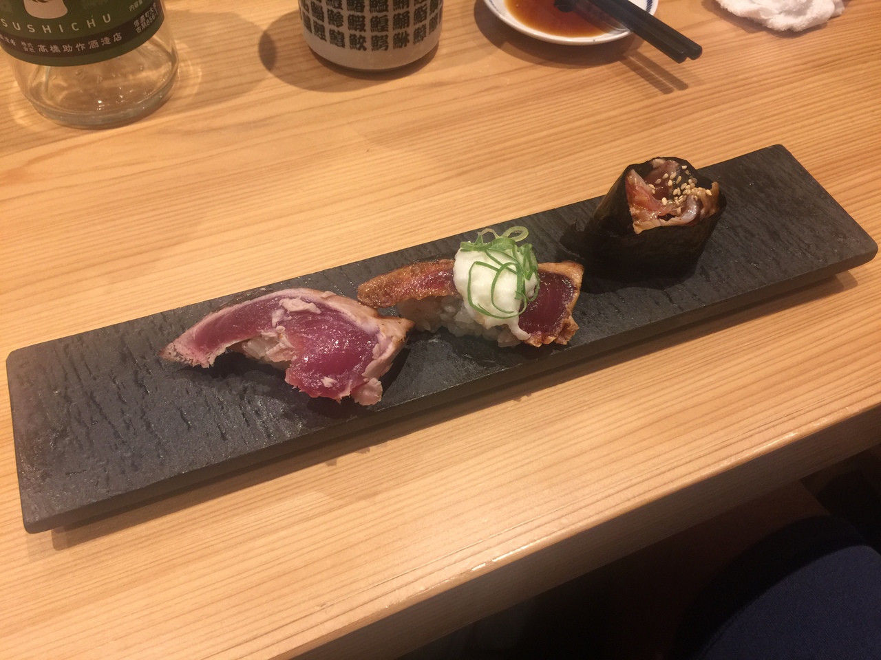 先ずは生ビール!まぐろ三貫に赤貝!欲張りカツオはカツオ、山かけ漬けカツオ、カツオユッケ軍歌!料理がなかなか出てきませんね。あまり食べないで〆!