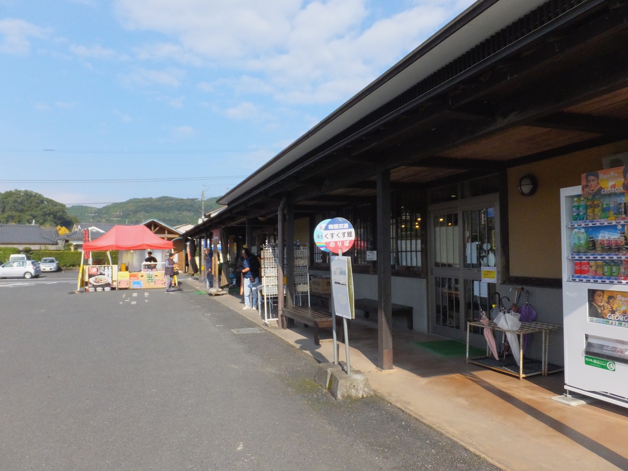 蒲生の観光は八幡神社と大楠と住吉池と城下町の武家屋敷と御仮屋門と・・・といろいろあるのですが、その観光案内所的な施設が2箇所あり、一方は観光交流センター、もうひとつがこのくすくす館です。歩いて2分くらいの距離にこの2つの物産館があるのはなぜなのか不明。ただ、このくすくす館は農産物の物産館としての性格がより強いようでした。なので、お買い物はこちら、観光、とくに武家屋敷跡を訪問するなら交流センターがいいでしょう。まあ、両方行くのが一番ですが。