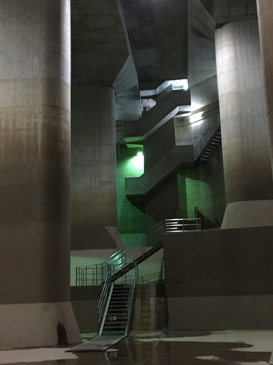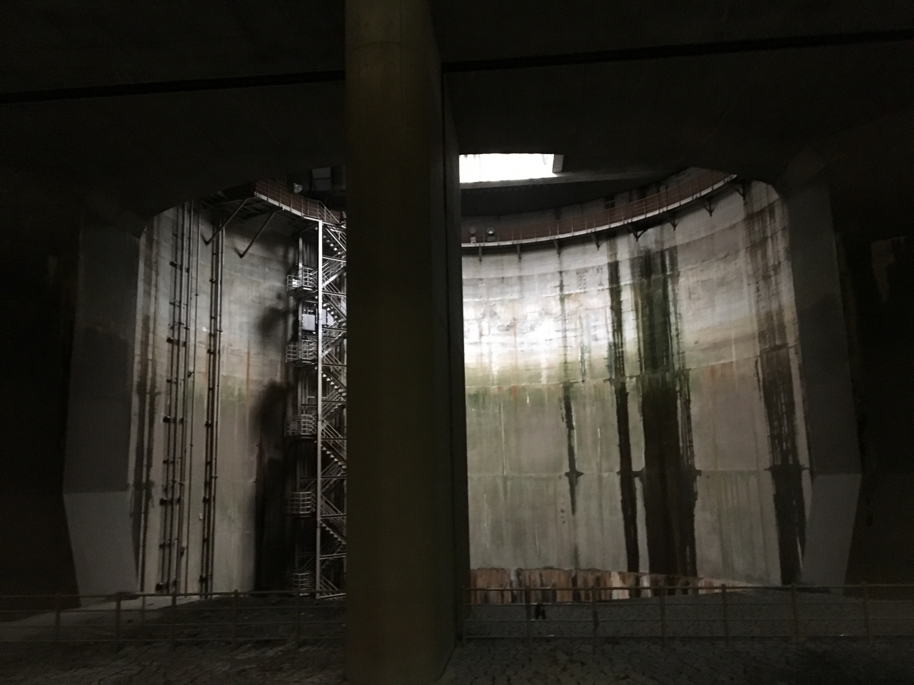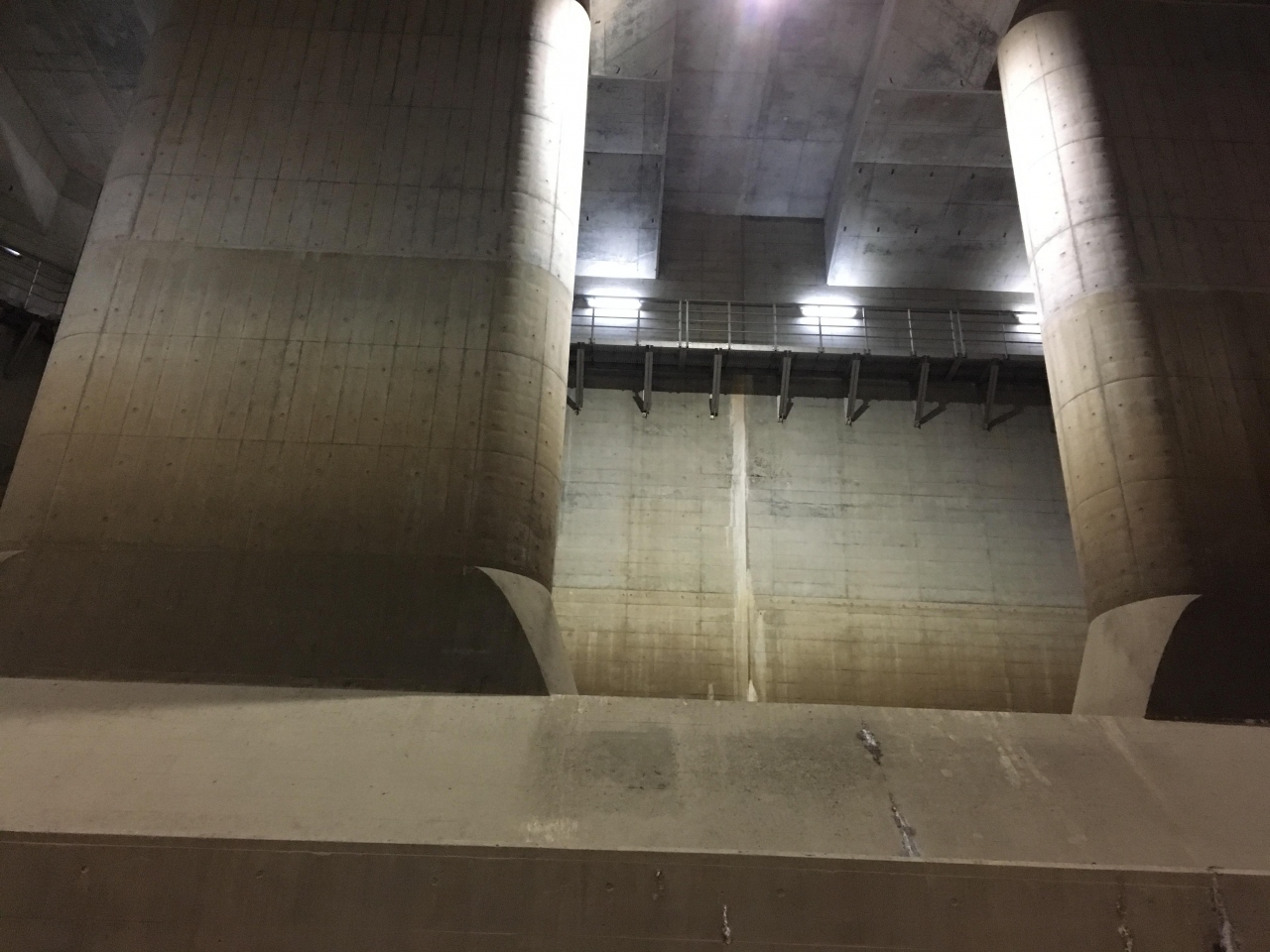 5河川すべての川からこの施設に流入し水位が巨大柱の上のほうまで達した