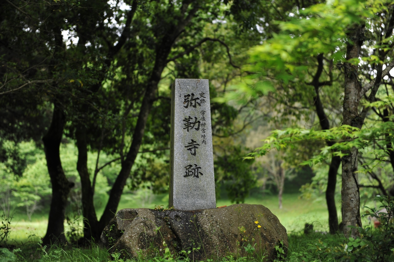 弥勒寺は六郷満山の第二番霊場に数えられる存在だ。寺伝によると、738年に宇佐神宮の神宮寺などを統一して弥勒寺が創建されたという。場所は呉橋から伸びる西参道の南側だ。現在も残る八坂神社(祇園社)は守護神として創立されたものだ。しかし、明治維新後の初期の廃仏毀釈により、弥勒寺は廃寺となった。今は石碑や礎石の一部が残るだけだ。