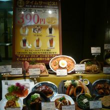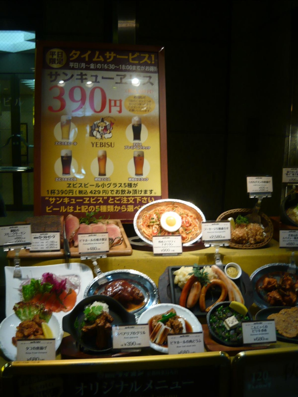 場所は阪急四条烏丸駅・地下鉄烏丸駅から歩いて3分足らず。駅から地下道直結ですので雨にも濡れずに到着できます。平日の16時30分から18時までの間やっているタイムサービス(サンキューエビス)を利用しました。エビス生ビール、エビスプレミアムブラック、エビス&エビス、琥珀&ブラックなど5種類のエビスビールが小グラス一杯390円で頂けます。この日は唐揚げや出し巻、茸のホイル焼きなどをあてに全種のビールを頂きました。ビール好きにオススメお店です。