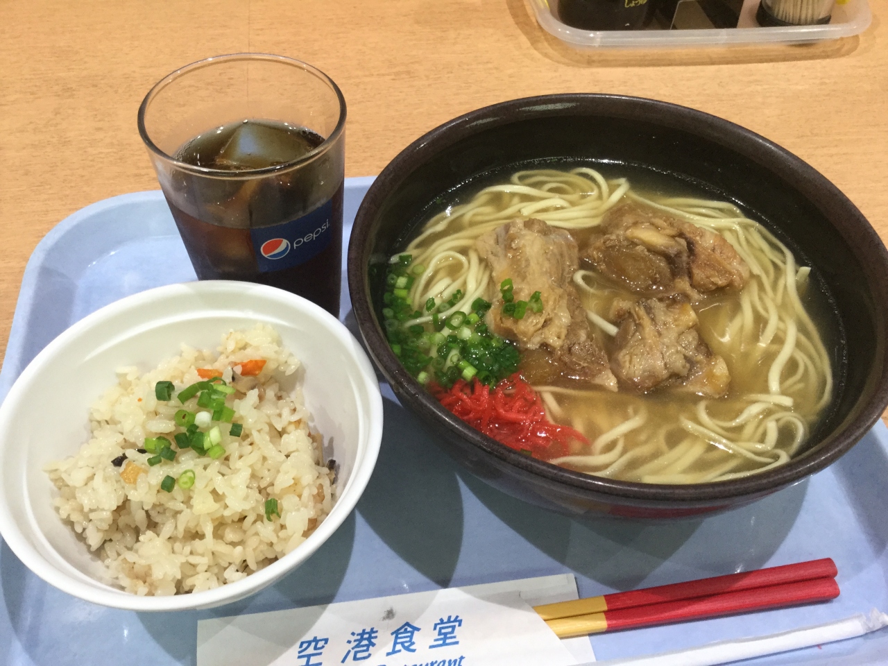 沖縄空港の到着ロビーの1番端にある食堂です。食事は食券を券売機で買ってからお店の人に渡します。沖縄料理のソーキそばや、ゴーヤチャンプルなどの定食がお得な値段で用意されています。値段が安いからか、多くの人が利用して食事の時間帯は混んでいます
