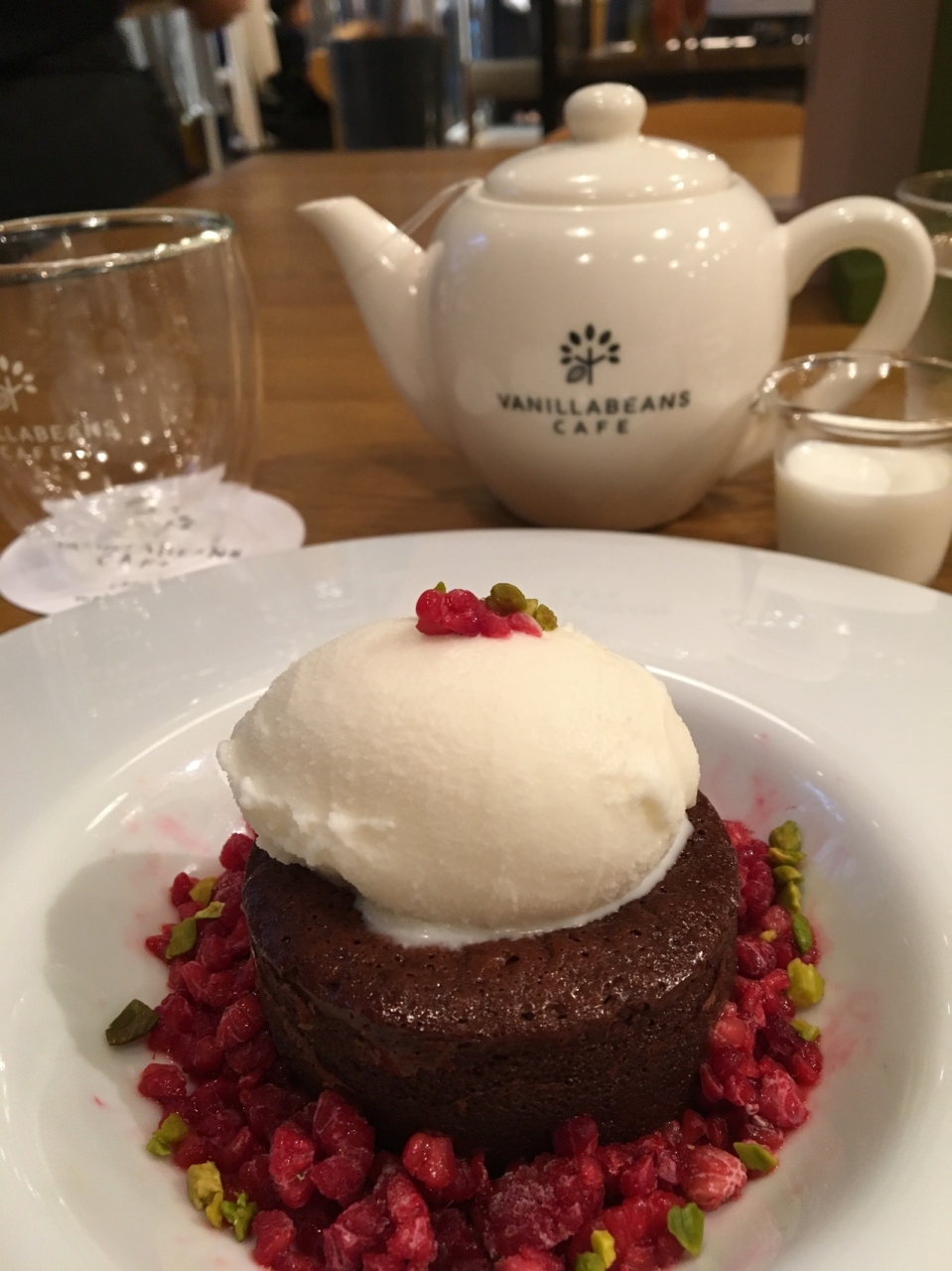 フォンダンショコラは、味の重なりがお見事です。トロリと溶け出すチョコレートとさっぱりしたミルクアイスクリーム、まわりを彩るフランボワーズ。食感もリズミカルです。ドリンクはコーヒーか紅茶から。紅茶はアールグレイのポットサービスです。