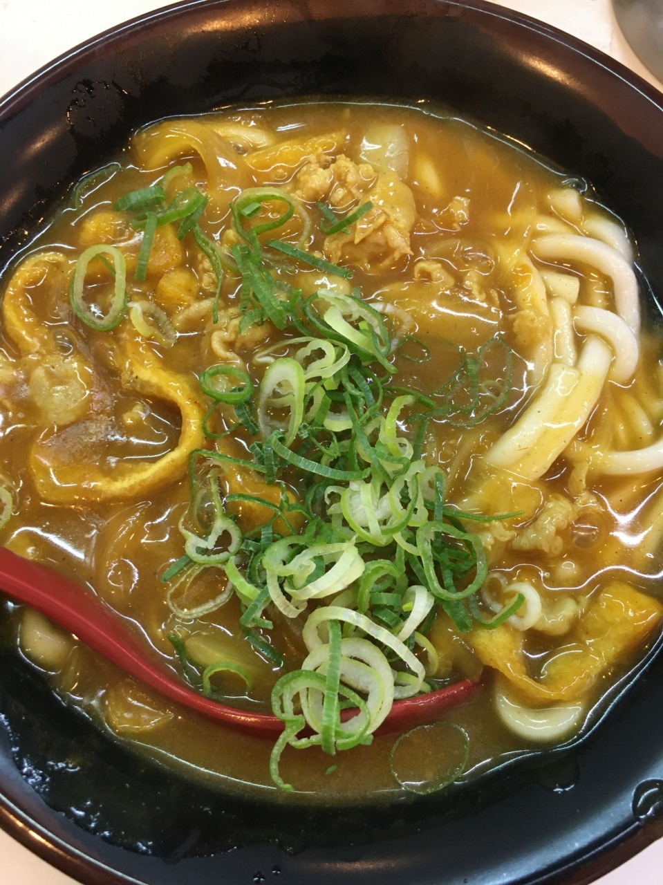 コの字型の店内には自動食券気が3つありカレーうどんの券を購入。他のうどんはさっと茹で上げていましたが、カレーーうどんは汁から作っていたので出てくるまでに10分ぐらいかかりました。ネギと肉がのっていて柔らかいうどんでした。カレースープは食べているうちに美味くなり全部飲み干しました。カレーうどんセットと言うのもあり、ごはんがついているのでうどんの汁でカレーライスになるのでお勧めと店の人が言っていました。