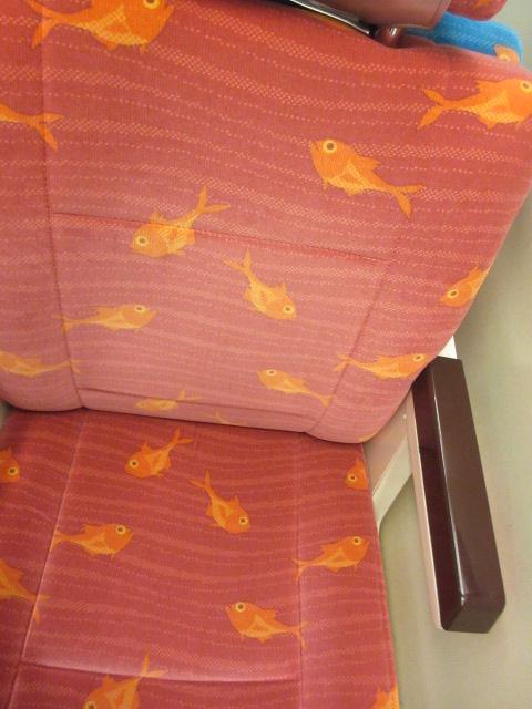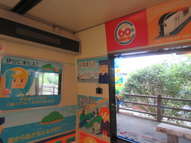 伊豆急行線内を走っている電車です。特別に料金がかかるわけでなく、乗車賃だけで特別列車に乗れるのでうれしいです。こんかいもたまたまですが「キンメ電車」が到着してラッキーでした。外観も赤いですが、車内も赤です。椅子にもキンメの模様がついていてかわいい。伊豆急がプラレールとコラボしていたので、コラボの案内も車内にありました。