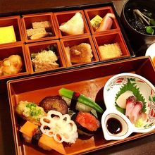 内容は、炊き合わせ・お惣菜8品・お造り・お椀・野菜寿し・甘味・コーヒーが出てきました。