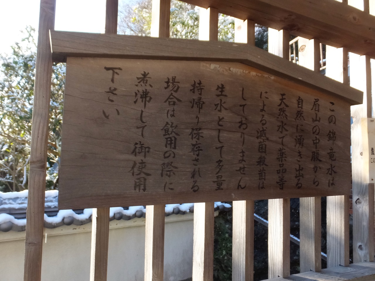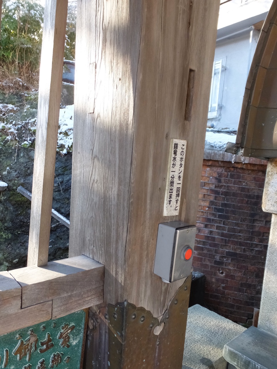 徳島は三角州の街ですが、眉山がすぐ後ろに控え、その山麓は当然湧き水が。この錦竜水もそのひとつ。ロープウェイの駅の右手の寺町の中にひっそりとあります。道路端に立派なお社になってますのですぐにわかりました。ボタンを押すと1分間出るという面白いしかけ。飲んでいると冬なのに暖か。ちょっと甘く感じるのは気温のせいなのか。