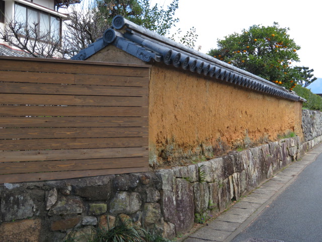 堀内伝建地区から北門屋敷に戻る途中で見つけました。土塀とありましたが、これこそ土塀という本当の土塀です。全体が土塀になっているわけではなく、左側が木の塀で、右が石の塀で土塀はほんの一部なのでお見逃しなく。