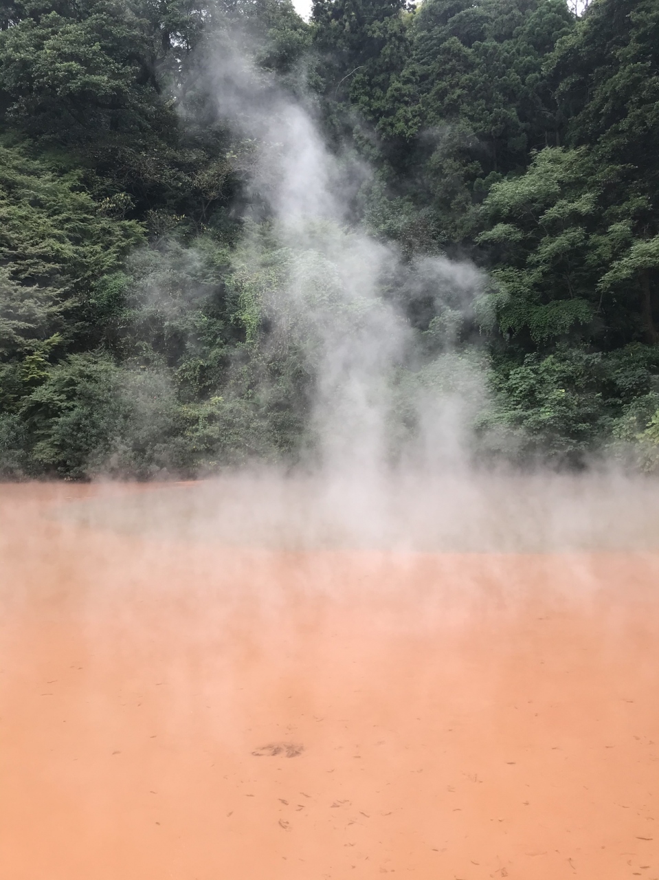 チケットを買ってお土産屋さんを通り抜けると血の池地獄です。赤いんですけど、近くで見るとお湯が赤いというより底の土が赤いです。