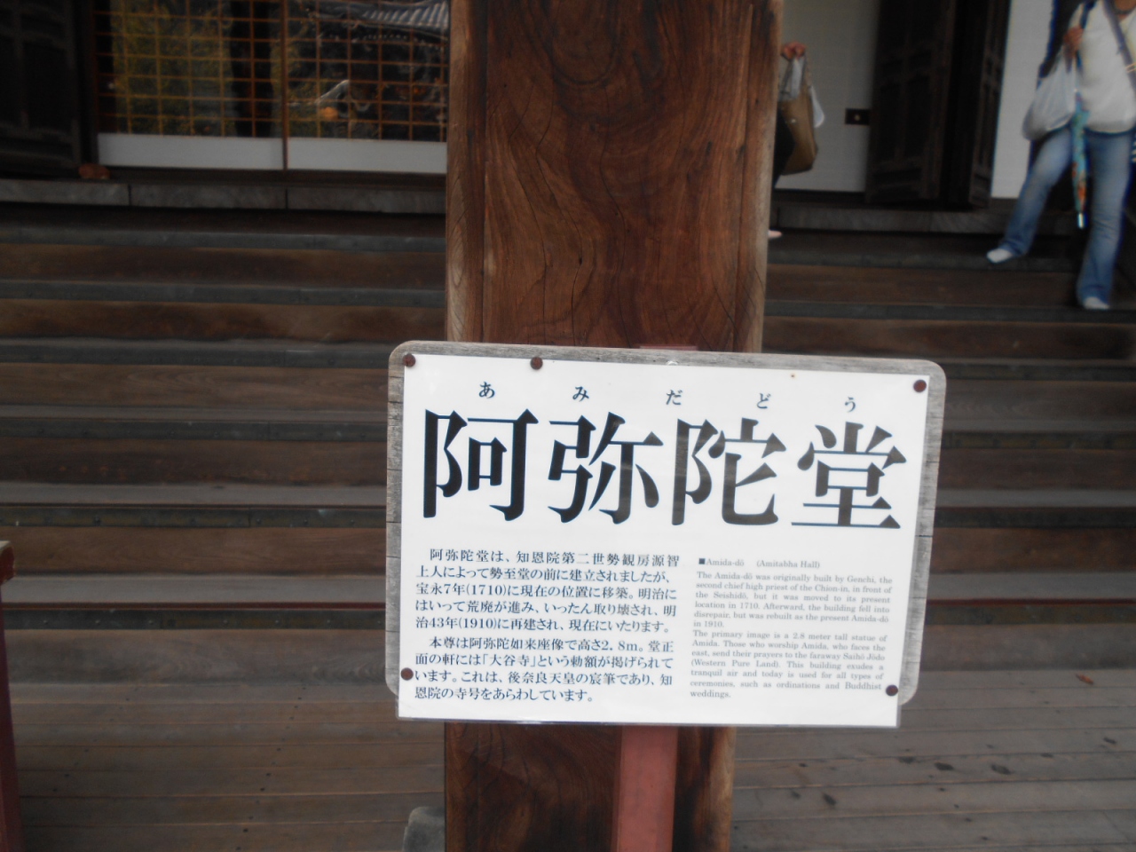 知恩院阿弥陀堂は、三門をくぐり坂を上って境内の左側にあります。御影堂の近くです。阿弥陀堂は明治43年に再建されたそうです。阿弥陀如来座像が安置されています。阿弥陀堂の前にわかりやすい説明プレートがありました。