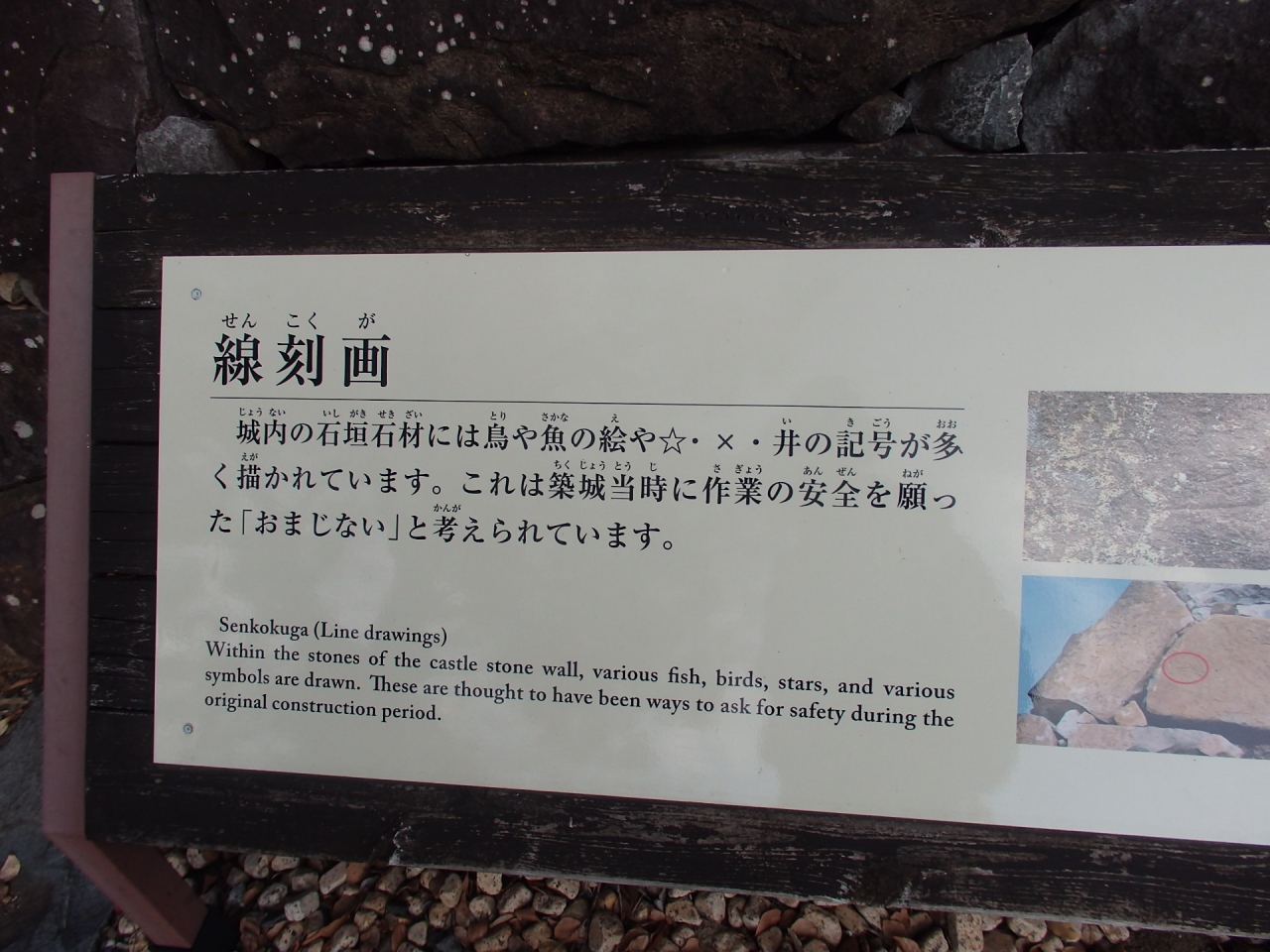 稲荷櫓の石垣に線刻画が描かれています。説明版によると、「城内の石垣に鳥、魚の絵、★、井等が描かれていています。・・・・・」とあります。ようやく一か所見つけることが出来ました。見ても良くわからないので、想像を働かせる必要があります。年寄りは根気が続かないのであきらめました。何が描かれているのか全くわかりませんでした。説明版にある拡大写真の絵も何が描かれているのかわかりませんでした。挑戦してみて下さい