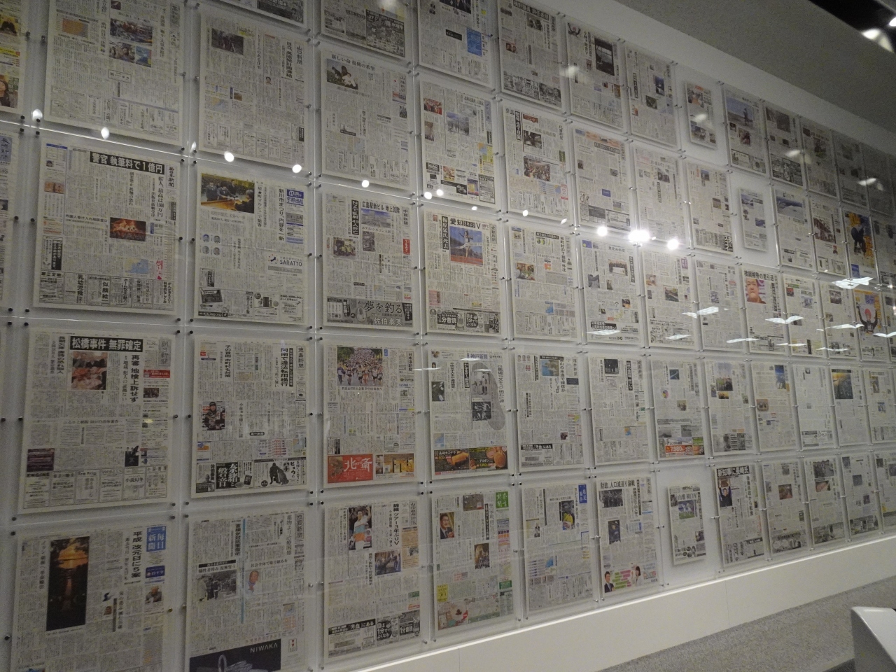 入館すると全国紙や地方紙、スポーツ紙が壁一面に掲示されなかなか壮観です。