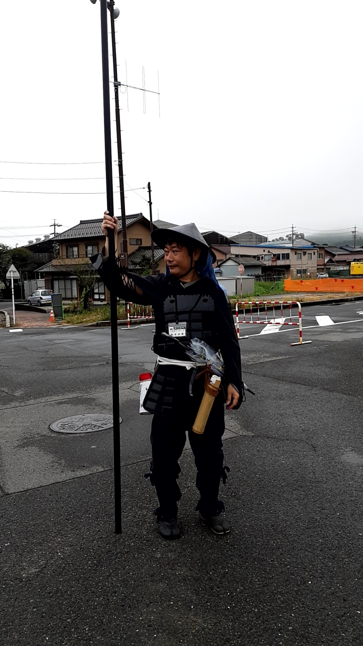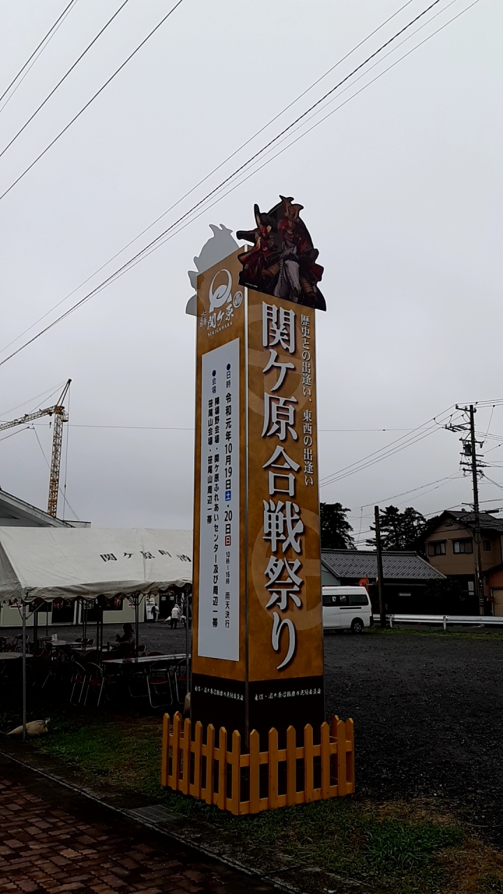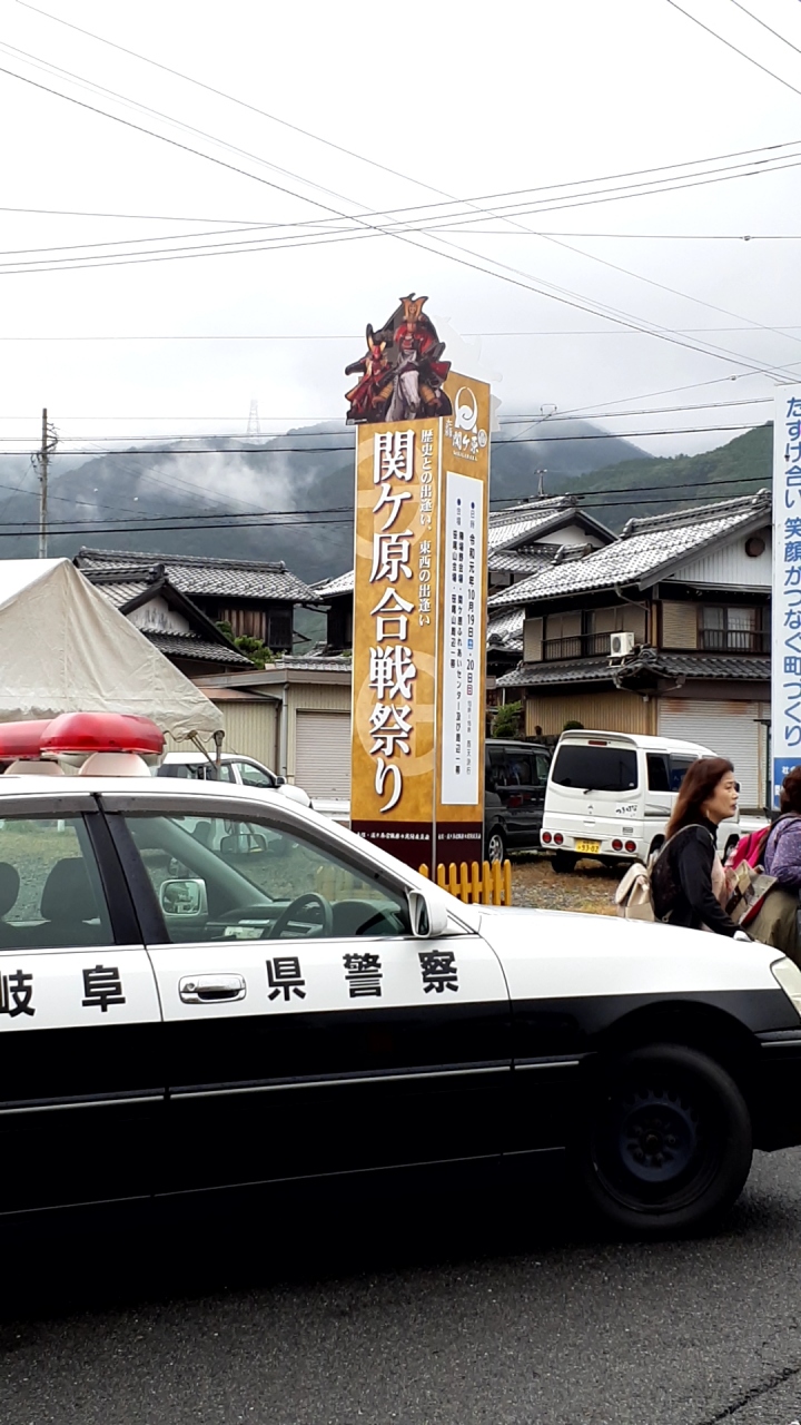岐阜県大垣市内から地道で40分程度で関ケ原の町役場の近くに到着したのですが、あちこちに祭りの登りが立てられ、あちこち警察が交通封鎖をされ、肝心の合戦場に車で近づけなかった。