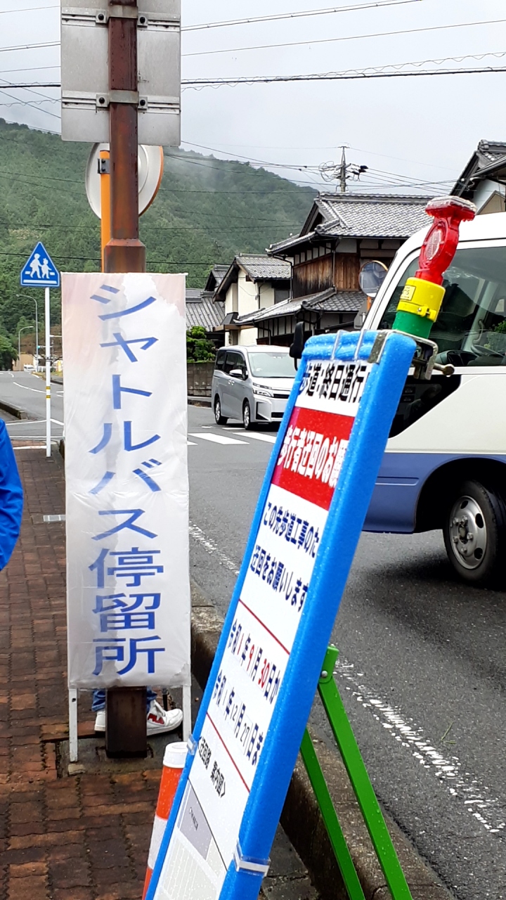 しかたなく、交通整理の役場の担当者に聞くと、ちょうど祭りが開催中で、メインとなるところは一般車が入れないとのこと。町役場の無料駐車場に車を置いて、そこまで無料シャトルバスがあるとのこと。