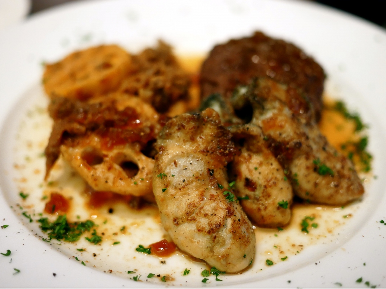ハンバーグに牡蠣ステーキ、挽肉と一緒にソテーされた蓮根が添えられています。