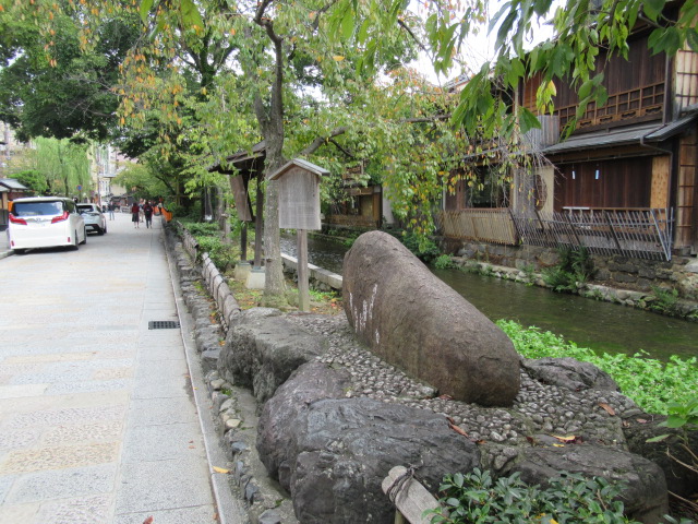 その白川沿いに「かにかくに碑」は建っています。この歌碑は吉井勇の作で石碑は1955年に吉井勇や谷崎潤一郎らによって建立されました。歌碑は「かにかくに 祇園はこひし寝(ぬ)るときも 枕のしたを水のながるる」です。この歌は祇園への思いを詠んだものですが難しくて・・・すばらしいです。
