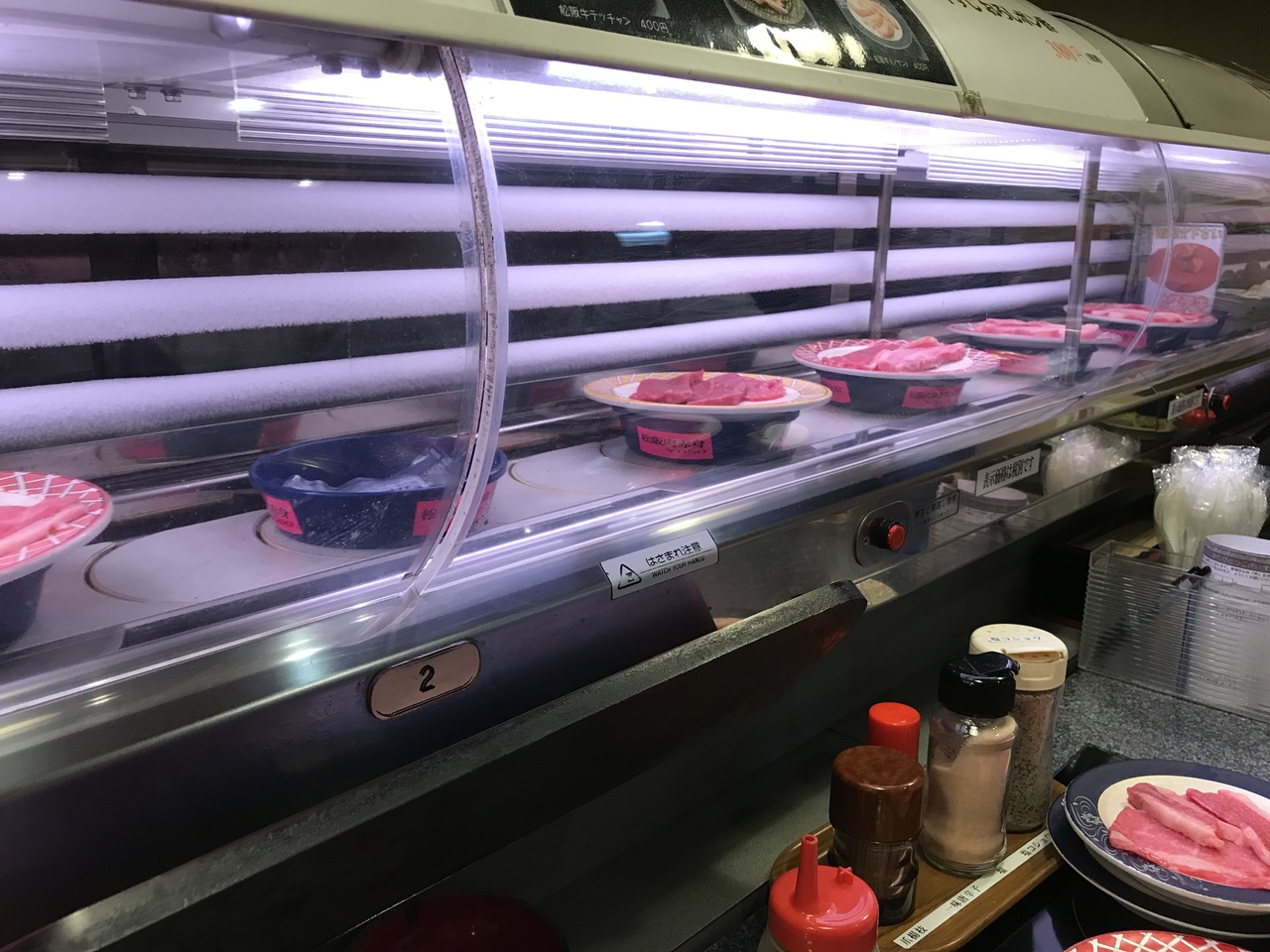 入って、回転焼肉は、左手。右手は、通常の焼肉です。店員に値段はどうなのか?確認した所、回転焼肉は、通常の焼肉と比べ値段は、1/2デスが量も1/2とのこと。グラム単価は変わらないが、回転焼肉は、色々なお肉をちょっとずつ食べれるので、人気とのことでした。