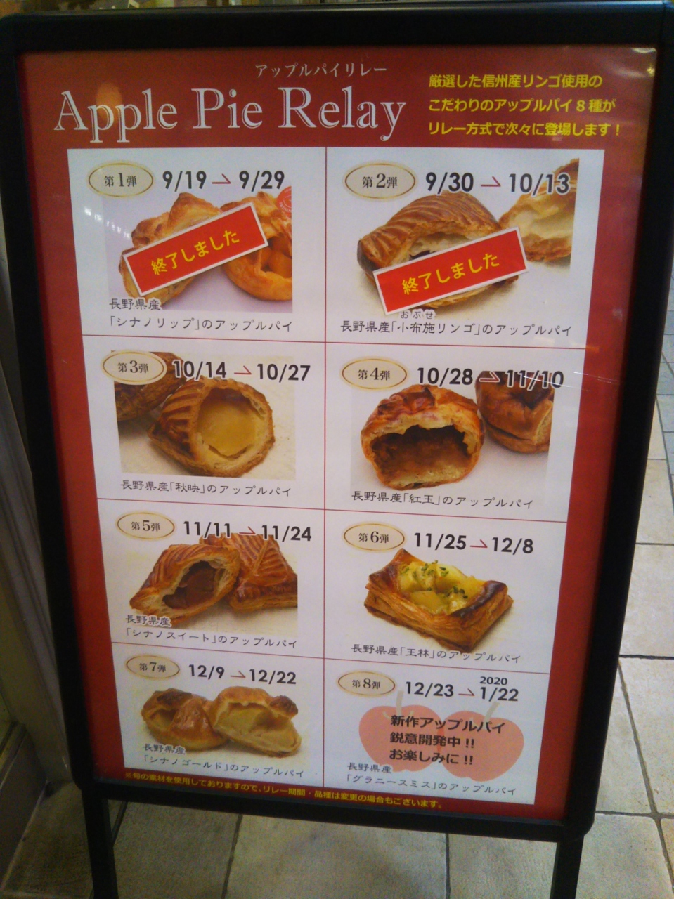 JR上野駅の構内、上がった側にあるエキュート上野にあるベーカリーです。長野、軽井沢で人気のベーカリーです。9月から長野のりんごを使ったアップルパイのキャンペーンをしています。秋映のアップルパイはりんごのシャキシャキ食感と甘酸っぱさがおいしかったです。夜になると残ったパンを袋詰めされて特売されていることもあります。
