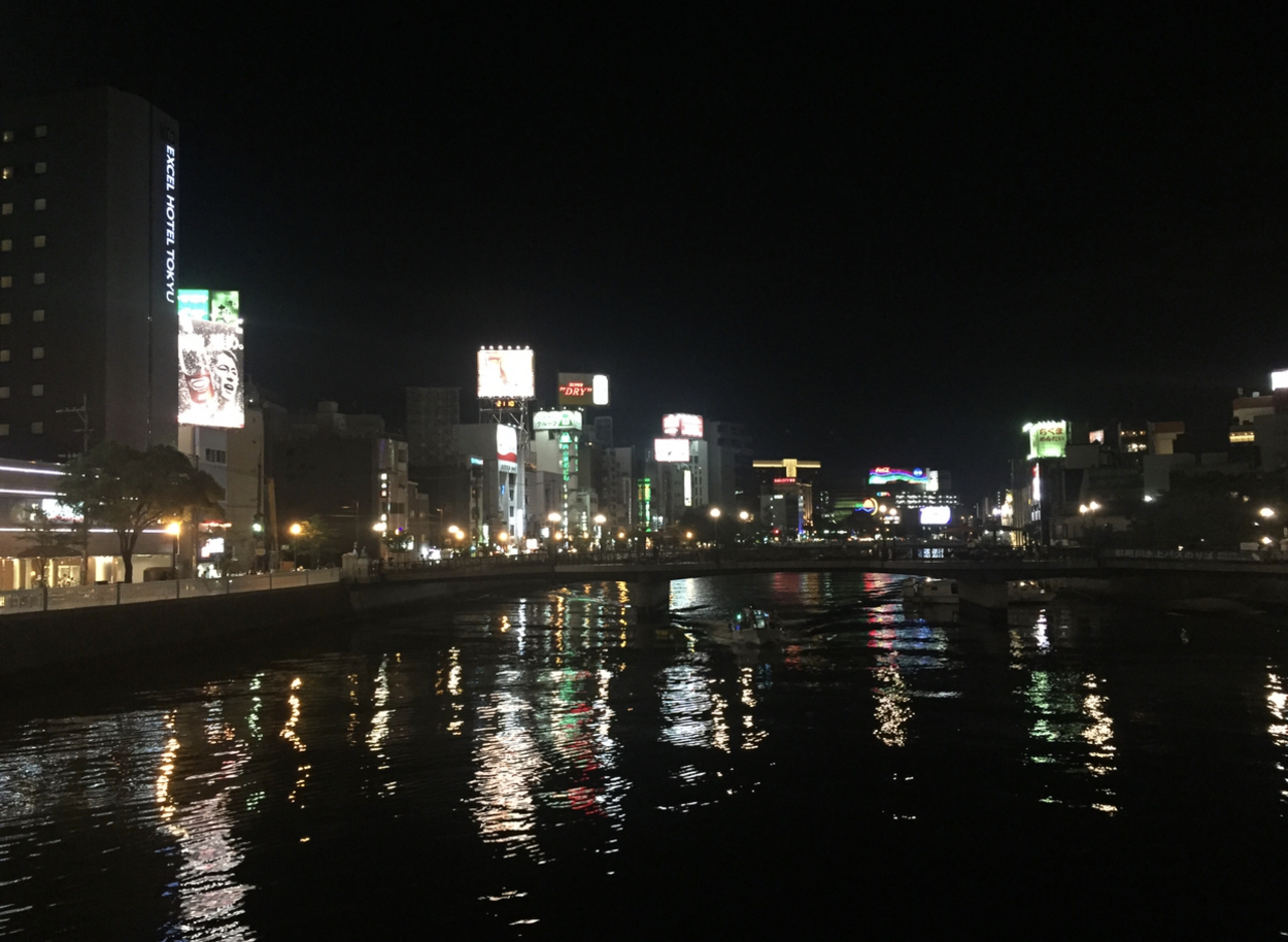 西大橋は天神と中洲を結ぶ大きなメイン通りの橋です。夜になると綺麗なネオンの看板が光り輝き、川辺に映り出されるので飲んだ後の帰り道には最高に綺麗です。少し歩くと中洲屋台も沢山あるので風情溢れてどこか懐かしい感じが味わえます。