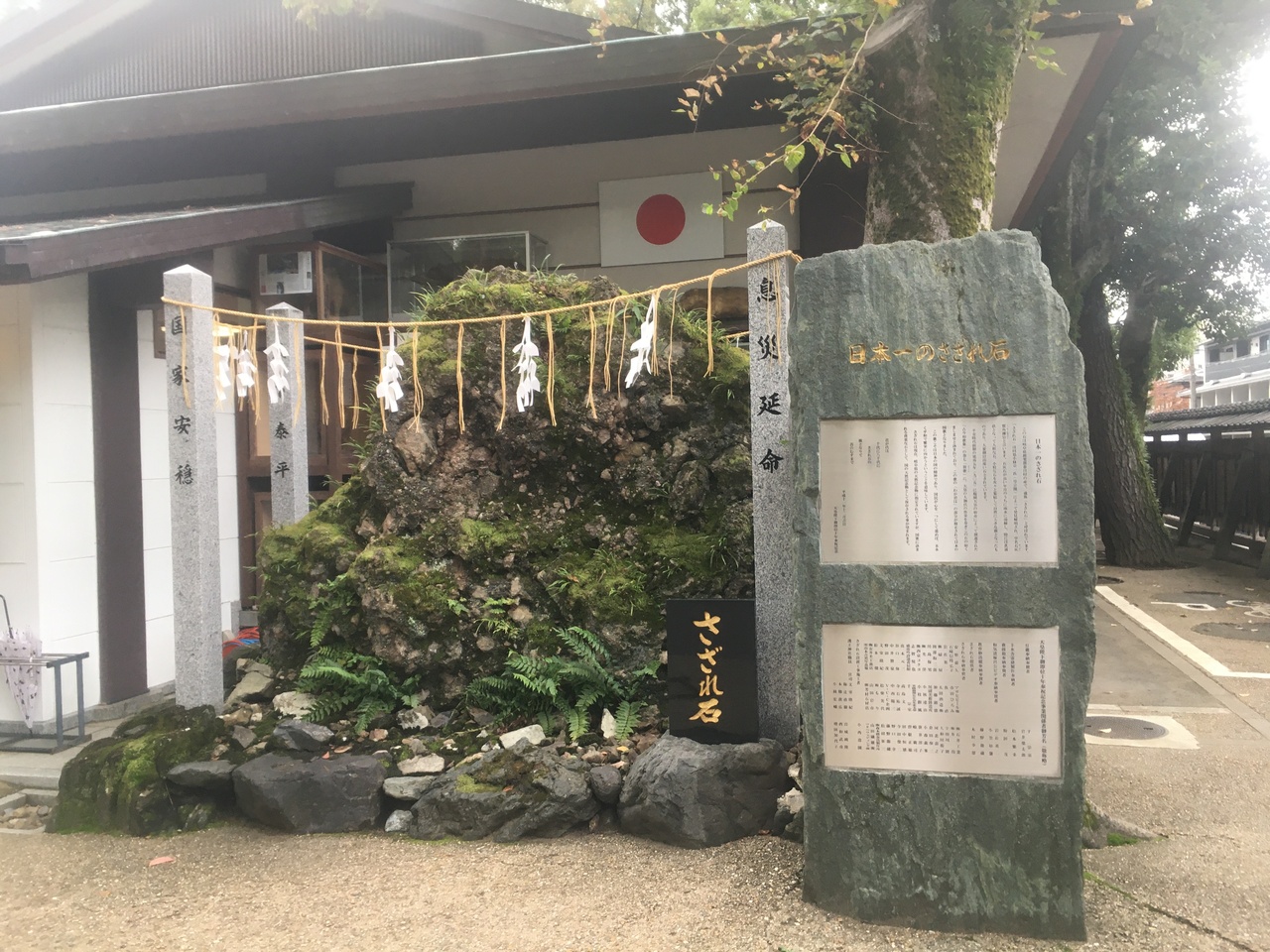 京都市営地下鉄烏丸駅から徒歩で8分くらいです。京都御所の蛤御門の西にある護王神社の境内にあります。和気清麻呂像の後ろあたりで目立ちませんでした。「君が代」に出てくる「さざれ石」ですが日本一の大きさで縦2、横3メートルもあると書いてあります。縁起が良いのでしょう!
