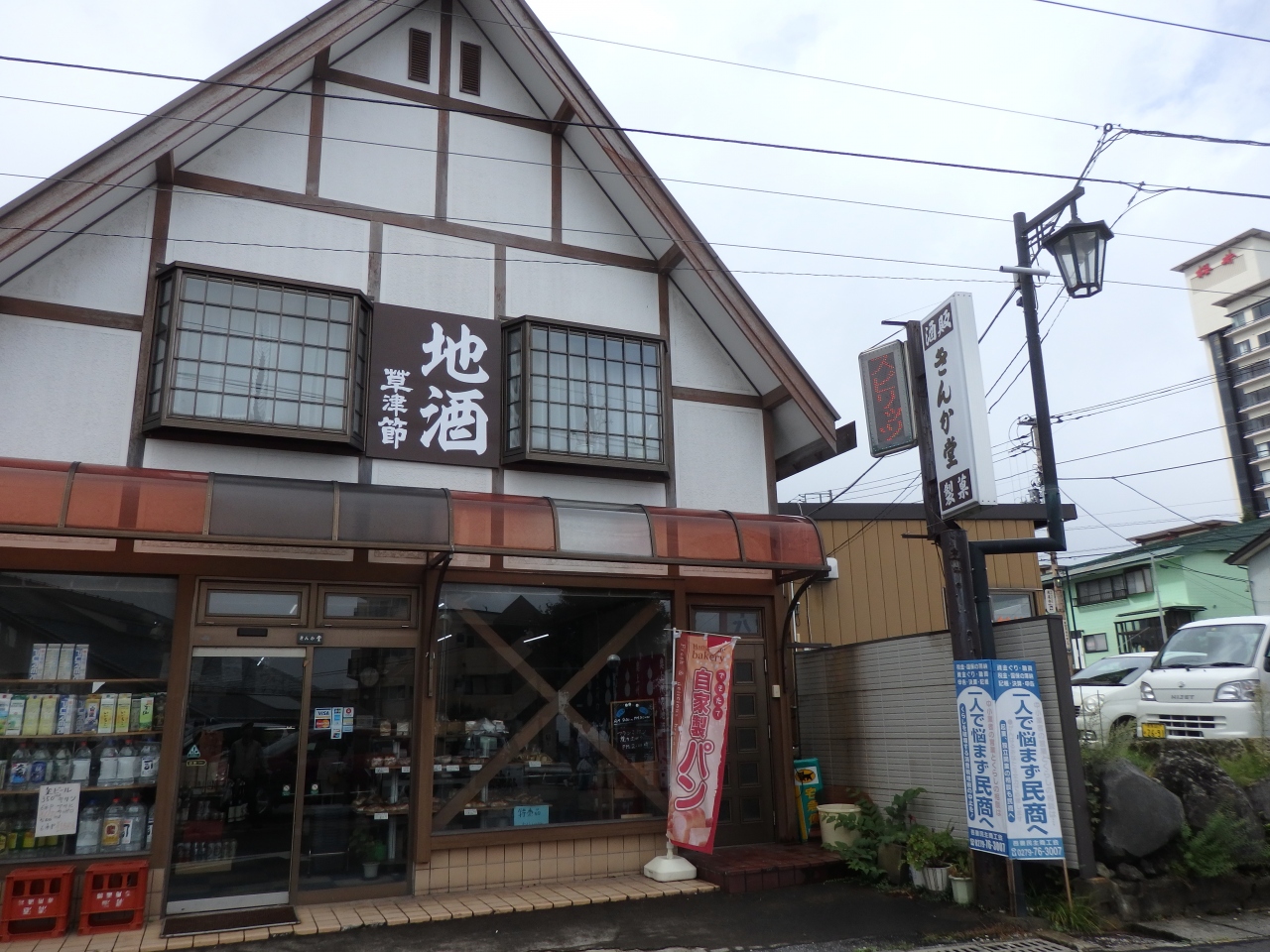 入口から見ると左側は酒の並んでいる棚、右側は手作りパンの売っている棚、レジ前はシュークリームやケーキなどの洋菓子の売っているショーケースがある面白い店です。