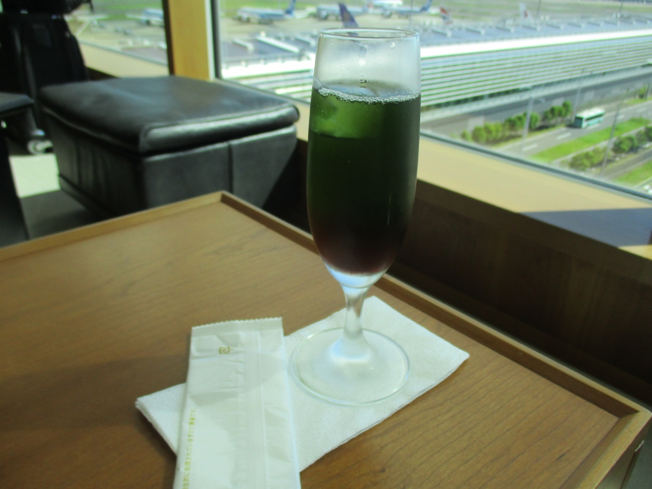 ヌードルバー反対側に有るバーカウンターでは、さまざまなドリンクメニューが注文できます。ウィスキー、カクテル、日本酒があり久保田まで置いてありましたが、やはり、キャセイパシフィック羽田オリジナルのカクテル「羽田ジェイト」を注文しました。緑茶ベースの飲みやすいさわやかな味のカクテルでした。