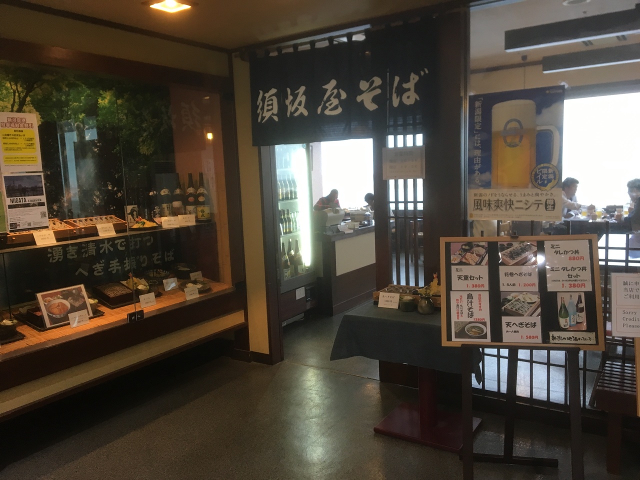 へぎそばの須坂屋の空港店です。新潟空港ビルの三階にあります。するっとした感触のそばが美味しいです。普通のそばももちろんありました。へぎそばは、ざるも木の器で観光客向けでした。空港なのにクレジットカード不可です。注意が必要です。