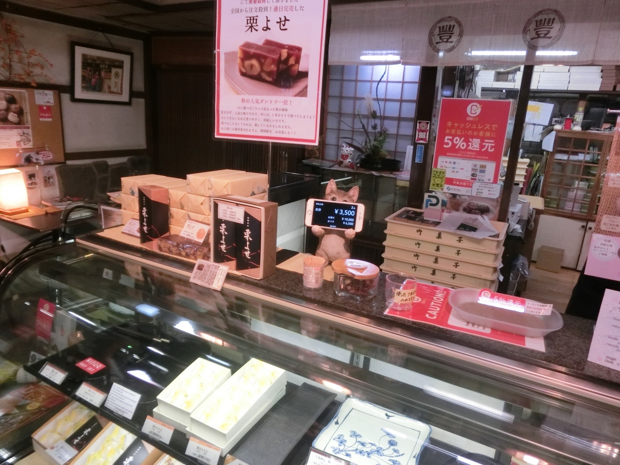 ショーケースの上に試食用の栗よせもクルミよせがたくさんあった。