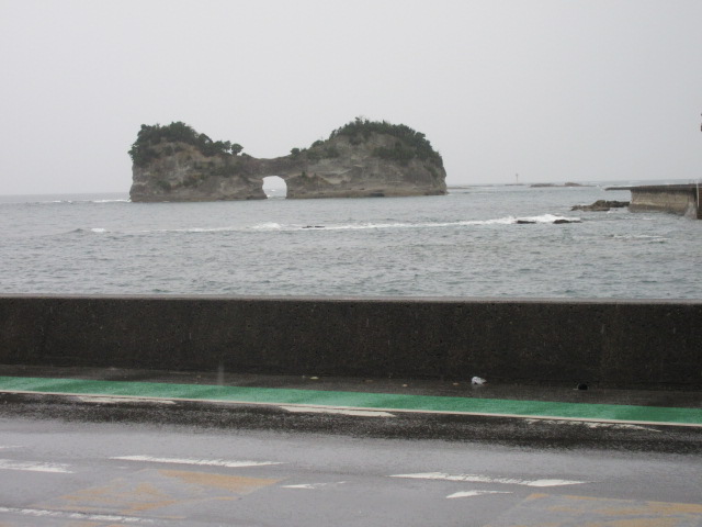 円月島は海の中にあるので、歩く場所でなく、遠景を見る場所。真ん中に穴のあいた面白い形です。1年に数回、丸い穴の中に日が入る、景色が見られるそうです。夕日の名所でもあり、昼間見るだけなら、タクシーで、見やすい場所に駐車してもらってみるだけで十分でした。