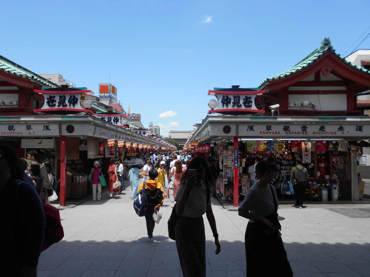 東京都内最古の寺”浅草寺”総門の雷門を入って宝蔵門までの250mの参道両側に所狭しと建ち並ぶ江戸名物の食べ物屋やお土産屋の通りです。江戸下町の情緒が残る町並みで買い物や食べ歩きを楽しめます。それにしても観光客が多いスポットです。